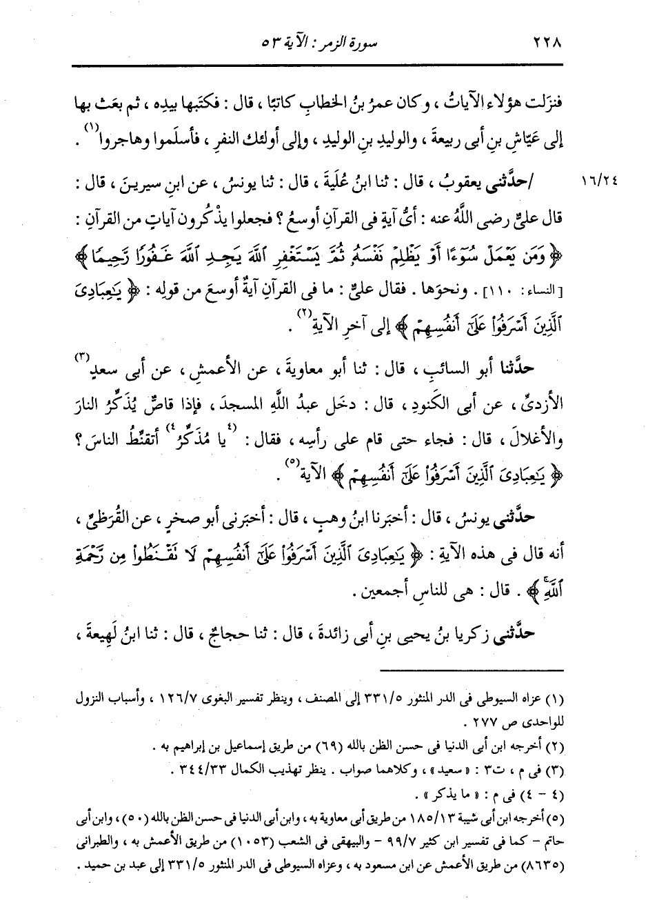 حَدَّثَنِي زَكَرِيَّا بْنُ يَحْيَى بْنِ أَبِي زَائِدَةَ، قَالَ: ثنا حَجَّاجٌ، قَالَ: ثنا ابْنُ لَهِيعَةَ، -[229]- عَنْ أَبِي قبيلْ، قَالَ: سَمِعْتُ أَبَا عَبْدِ الرَّحْمَنِ الْمُزَنِيَّ، يَقُولُ: ثني أَبُو عَبْدِ الرَّحْمَنِ الْجَلَائِيُّ، أَنَّهُ سَمِعَ ثَوْبَانَ، مَوْلَى رَسُولِ اللَّهِ صَلَّى اللهُ عَلَيْهِ وَسَلَّمَ يَقُولُ: سَمِعْتُ رَسُولَ اللَّهِ صَلَّى اللهُ عَلَيْهِ وَسَلَّمَ يَقُولُ: " مَا أُحِبُّ أَنَّ لِيَ الدُّنْيَا وَمَا فِيهَا بِهَذِهِ الْآيَةِ: {§يَا عِبَادِيَ الَّذِينَ أَسْرَفُوا عَلَى أَنْفُسِهِمْ لَا تَقْنَطُوا مِنْ رَحْمَةِ اللَّهِ} [الزمر: 53] ". . . الْآيَةَ، فَقَالَ رَجُلٌ: يَا رَسُولَ اللَّهِ، وَمَنْ أَشْرَكَ؟ فَسَكَتَ النَّبِيُّ صَلَّى اللهُ عَلَيْهِ وَسَلَّمَ، ثُمَّ قَالَ: «أَلَا وَمَنْ أَشْرَكَ، أَلَا وَمَنْ أَشْرَكَ» ثَلَاثَ مَرَّاتٍ " وَقَالَ آخَرُونَ: نَزَلَ ذَلِكَ فِي قَوْمٍ كَانُوا يَرَوْنَ أَهْلَ الْكَبَائِرِ مِنْ أَهْلِ النَّارِ، فَأَعْلَمَهُمُ اللَّهُ بِذَلِكَ أَنَّهُ يَغْفِرُ الذُّنُوبَ جَمِيعًا لِمَنْ يَشَاءُ