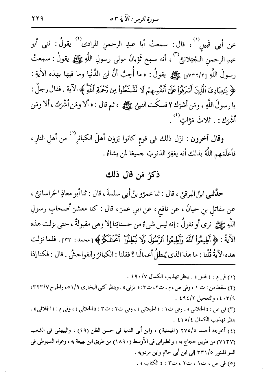ذِكْرُ مَنْ قَالَ ذَلِكَ: حَدَّثَنِي ابْنُ الْبَرْقِيِّ، قَالَ: ثنا عَمْرُو بْنُ أَبِي سَلَمَةَ، قَالَ: ثنا أَبُو مُعَاذٍ الْخُرَاسَانِيُّ، عَنْ مُقَاتِلِ بْنِ حَيَّانَ، عَنْ نَافِعٍ، عَنِ ابْنِ عُمَرَ، قَالَ: " كُنَّا مَعْشَرَ أَصْحَابِ رَسُولِ اللَّهِ صَلَّى اللهُ عَلَيْهِ وَسَلَّمَ نَرَى أَوْ نَقُولُ: إِنَّهُ §لَيْسَ شَيْءٌ مِنْ حَسَنَاتِنَا إِلَّا وَهِيَ مَقْبُولَةٌ، حَتَّى نَزَلَتْ هَذِهِ الْآيَةُ {أَطِيعُوا اللَّهَ وَأَطِيعُوا الرَّسُولَ وَلَا تُبْطِلُوا أَعْمَالَكُمْ} [محمد: 33] فَلَمَّا نَزَلَتْ هَذِهِ الْآيَةُ قُلْنَا: مَا هَذَا الَّذِي يُبْطِلُ أَعْمَالَنَا؟ فَقُلْنَا: الْكَبَائِرَ وَالْفَوَاحِشَ، قَالَ: فَكُنَّا إِذَا -[230]- رَأَيْنَا مَنْ أَصَابَ شَيْئًا مِنْهَا قُلْنَا: قَدْ هَلَكَ، حَتَّى نَزَلَتْ هَذِهِ الْآيَةُ {إِنَّ اللَّهَ لَا يَغْفِرُ أَنْ يُشْرَكَ بِهِ وَيَغْفِرُ مَا دُونَ ذَلِكَ لِمَنْ يَشَاءُ} [النساء: 48] فَلَمَّا نَزَلَتْ هَذِهِ الْآيَةُ كَفَفْنَا عَنِ الْقَوْلِ، فِي ذَلِكَ، فَكُنَّا إِذَا رَأَيْنَا أَحَدًا أَصَابَ مِنْهَا شَيْئًا خِفْنَا عَلَيْهِ، إِنْ لَمْ يُصِبْ مِنْهَا شَيْئًا رَجَوْنَا لَهُ " وَأَوْلَى الْأَقْوَالِ فِي ذَلِكَ بِالصَّوَابِ قَوْلُ مَنْ قَالَ: عَنَى تَعَالَى ذِكْرُهُ بِذَلِكَ جَمِيعَ مَنْ أَسْرَفَ عَلَى نَفْسِهِ مِنْ أَهْلِ الْإِيمَانِ وَالشِّرْكِ، لِأَنَّ اللَّهَ عَمَّ بِقَوْلِهِ {يَا عِبَادِيَ الَّذِينَ أَسْرَفُوا عَلَى أَنْفُسِهِمْ} [الزمر: 53] جَمِيعَ الْمُسْرِفِينَ، فَلَمْ يُخَصِّصْ بِهِ مُسْرِفًا دُونَ مُسْرِفٍ فَإِنْ قَالَ قَائِلٌ: فَيَغْفِرُ اللَّهُ الشِّرْكَ؟ قِيلَ: نَعَمْ إِذَا تَابَ مِنْهُ الْمُشْرِكُ وَإِنَّمَا عَنَى بِقَوْلِهِ {إِنَّ اللَّهَ يَغْفِرُ الذُّنُوبَ جَمِيعًا} [الزمر: 53] لِمَنْ يَشَاءُ، كَمَا قَدْ ذَكَرْنَا قَبْلُ أَنَّ ابْنَ مَسْعُودٍ كَانَ يَقْرَؤُهُ: وَأَنَّ اللَّهَ قَدِ اسْتَثْنَى مِنْهُ الشِّرْكَ إِذَا لَمْ يَتُبْ مِنْهُ صَاحِبُهُ، فَقَالَ: إِنَّ اللَّهَ لَا يَغْفِرُ أَنْ يُشْرَكَ بِهِ، وَيَغْفِرُ مَا دُونَ ذَلِكَ لِمَنْ يَشَاءُ، فَأُخْبِرَ أَنَّهُ لَا يَغْفِرُ الشِّرْكَ إِلَّا بَعْدَ تَوْبَةٍ بِقَوْلِهِ: {إِلَّا مَنْ تَابَ وَآمَنَ وَعَمِلَ صَالِحًا} [مريم: 60] فَأَمَّا مَا عَدَاهُ فَإِنَّ صَاحِبَهُ فِي مَشِيئَةِ رَبِّهِ، إِنْ شَاءَ تَفَضَّلَ عَلَيْهِ، فَعَفَا لَهُ عَنْهُ، وَإِنْ شَاءَ عَدَلَ عَلَيْهِ فَجَازَاهُ بِهِ