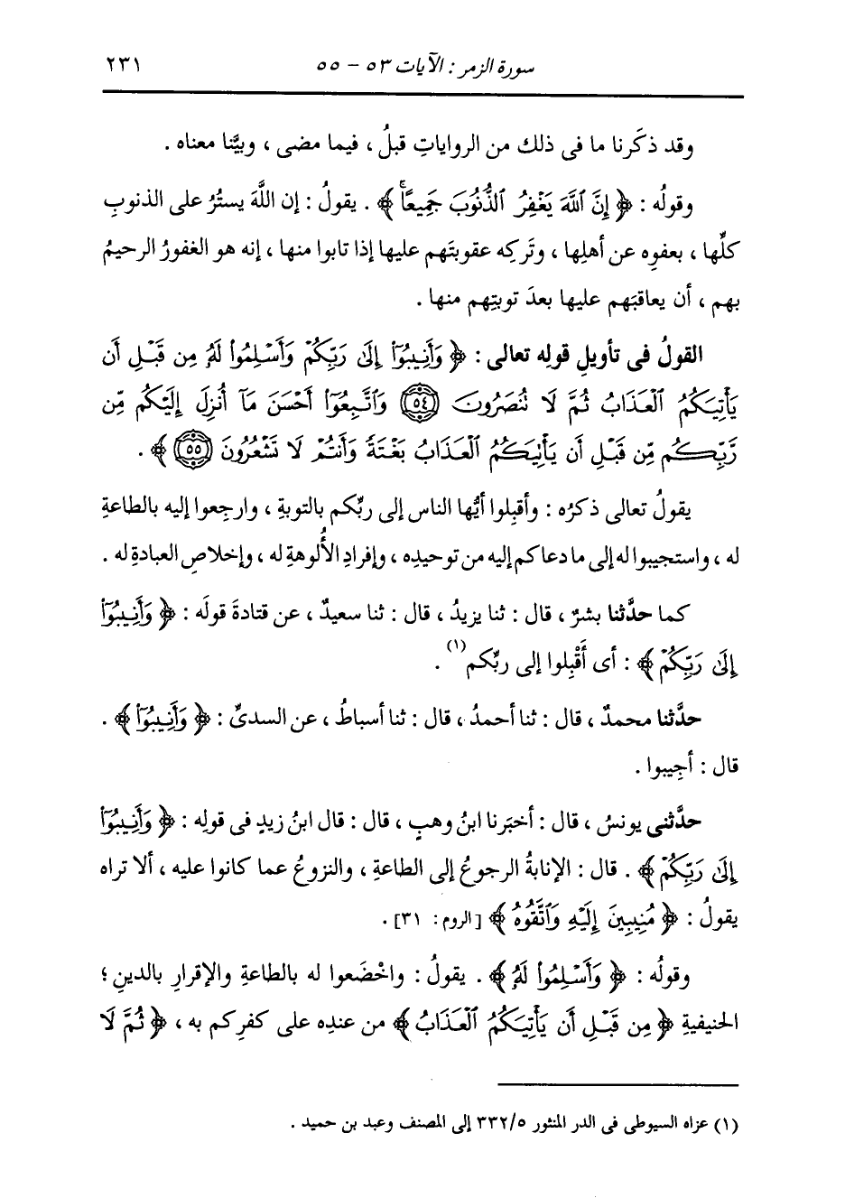 حَدَّثَنِي يُونُسُ، قَالَ: أَخْبَرَنَا ابْنُ وَهْبٍ، قَالَ: قَالَ ابْنُ زَيْدٍ، فِي قَوْلِهِ: {§وَأَنِيبُوا إِلَى رَبِّكُمْ} [الزمر: 54] قَالَ: " الْإِنَابَةُ: الرُّجُوعُ إِلَى الطَّاعَةِ، وَالنِّزُوعُ عَمَّا كَانُوا عَلَيْهِ، أَلَا تَرَاهُ يَقُولُ ": {مُنِيبِينَ إِلَيْهِ وَاتَّقُوهُ} [الروم: 31]