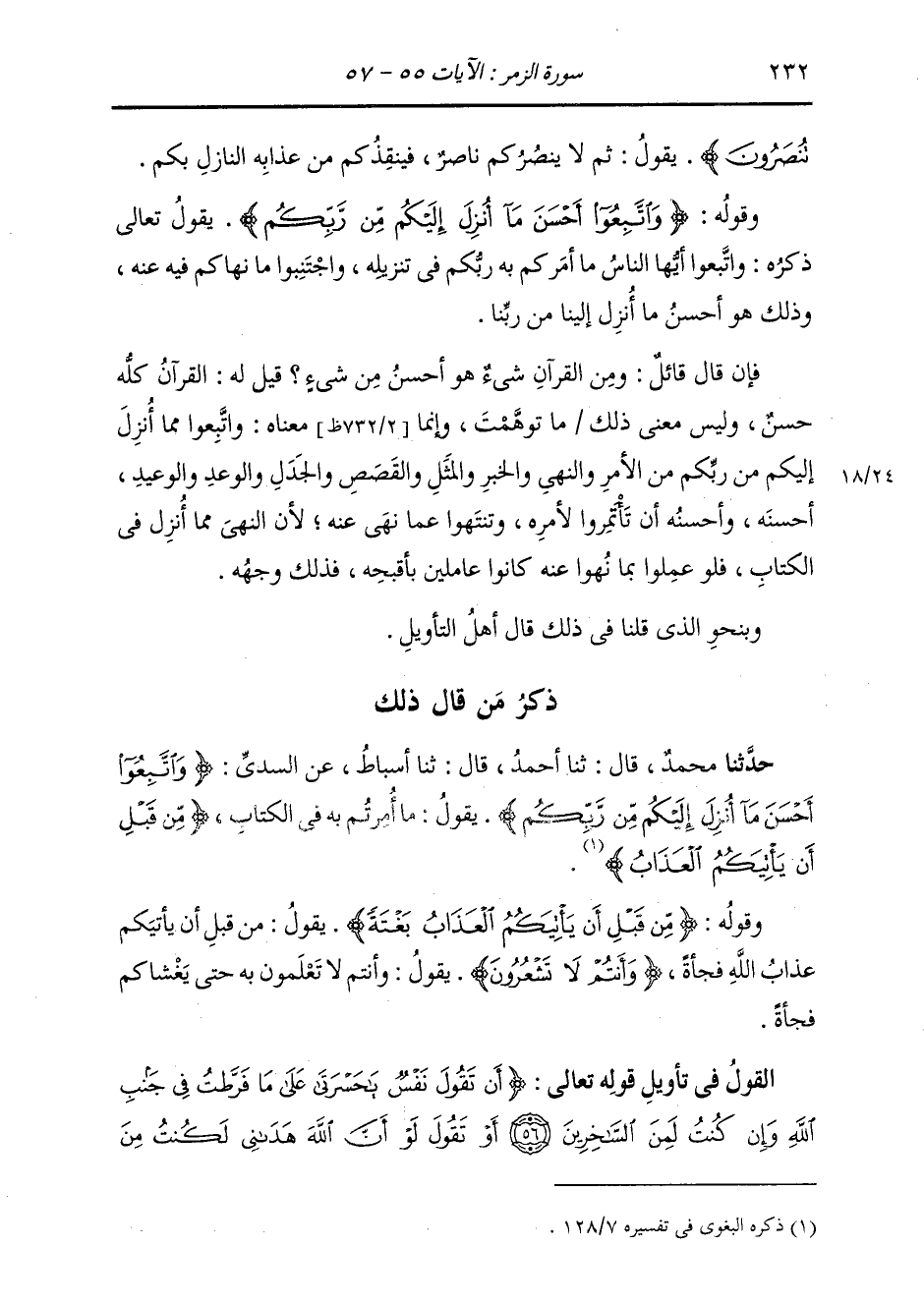 §وَقَوْلُهُ: {وَاتَّبَعُوا أَحْسَنَ مَا أُنْزِلَ إِلَيْكُمْ مِنْ رَبِّكُمْ} [الزمر: 55] يَقُولُ تَعَالَى ذِكْرُهُ: وَاتَّبِعُوا أَيُّهَا النَّاسُ مَا أَمَرَكُمْ بِهِ رَبُّكُمْ فِي تَنْزِيلِهِ، وَاجْتَنِبُوا مَا نَهَاكُمْ فِيهِ عَنْهُ، وَذَلِكَ هُوَ أَحْسَنُ مَا أُنْزِلَ إِلَيْنَا مِنْ رَبِّنَا فَإِنْ قَالَ قَائِلٌ: وَمِنَ الْقُرْآنِ شَيْءٌ وَهُوَ أَحْسَنُ مِنْ شَيْءٍ؟ قِيلَ لَهُ: الْقُرْآنُ كُلُّهُ حَسَنٌ، وَلَيْسَ مَعْنَى ذَلِكَ مَا تَوَهَّمْتَ، وَإِنَّمَا مَعْنَاهُ: وَاتَّبِعُوا مِمَّا أَنْزَلَ إِلَيْكُمْ رَبُّكُمْ مِنَ الْأَمْرِ وَالنَّهْي وَالْخَبَرِ وَالْمَثَلِ وَالْقَصَصِ وَالْجَدَلِ وَالْوَعْدِ وَالْوَعِيدِ أَحْسَنَهُ، أَنْ تَأْتَمِرُوا لَأَمْرِهِ، وَتَنْتَهُوا عَمَّا نَهَى عَنْهُ، لِأَنَّ النَّهْيَ مِمَّا أُنْزِلَ فِي الْكِتَابِ، فَلَوْ عَمِلُوا بِمَا نُهُوا عَنْهُ كَانُوا عَامِلِينَ بِأَقْبَحِهِ، فَذَلِكَ وَجْهُهُ وَبِنَحْوِ الَّذِي قُلْنَا فِي ذَلِكَ قَالَ أَهْلُ التَّأْوِيلِ