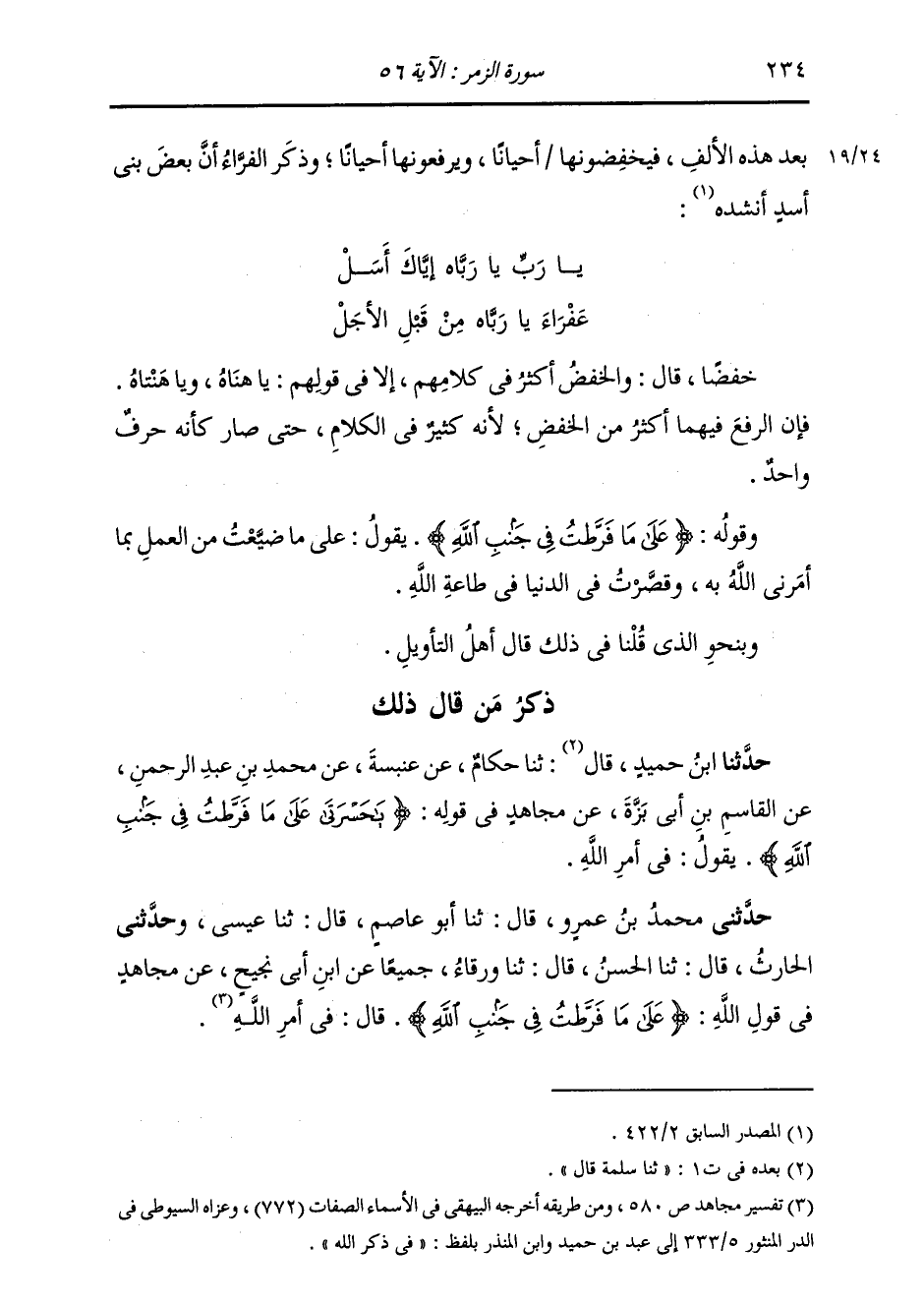 حَدَّثَنِي مُحَمَّدُ بْنُ عَمْرٍو، قَالَ: ثنا أَبُو عَاصِمٍ، قَالَ: ثنا عِيسَى؛ وَحَدَّثَنِي الْحَارِثُ، قَالَ: ثنا الْحَسَنُ، قَالَ: ثنا وَرْقَاءُ، جَمِيعًا عَنِ ابْنِ أَبِي نَجِيحٍ، عَنْ مُجَاهِدٍ، فِي قَوْلِ اللَّهِ: {§عَلَى مَا فَرَّطْتُ فِي جَنْبِ اللَّهِ} [الزمر: 56] قَالَ: «فِي أَمْرِ اللَّهِ»
