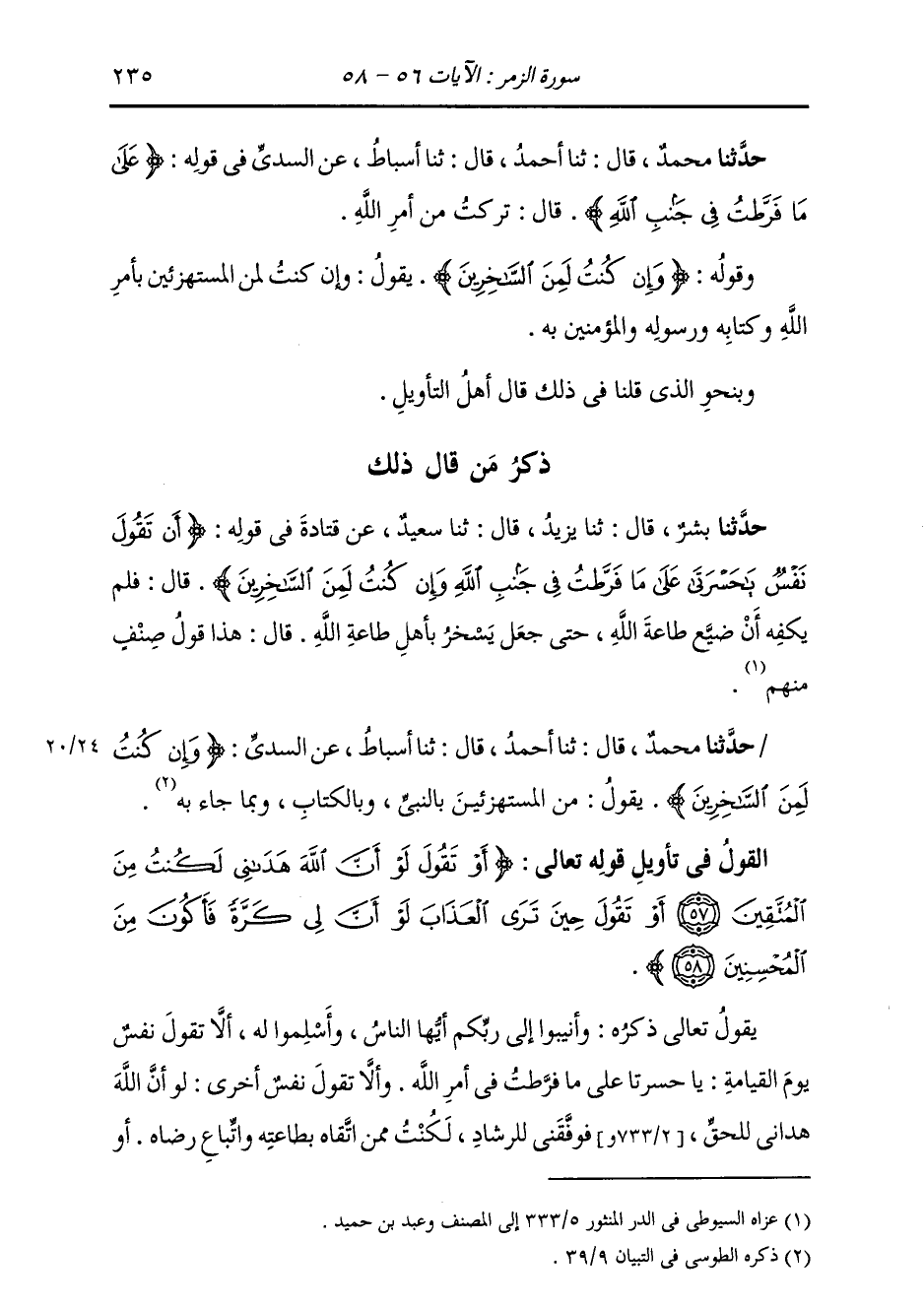 حَدَّثَنَا مُحَمَّدٌ، قَالَ: ثنا أَحْمَدُ، قَالَ ثنا أَسْبَاطٌ، عَنِ السُّدِّيِّ، {§وَإِنْ كُنْتُ لَمِنَ السَّاخِرِينَ} [الزمر: 56] يَقُولُ: «مِنَ الْمُسْتَهْزِئِينَ بِالنَّبِيِّ صَلَّى اللهُ عَلَيْهِ وَسَلَّمَ وَبِالْكِتَابِ، وَبِمَا جَاءَ بِهِ»