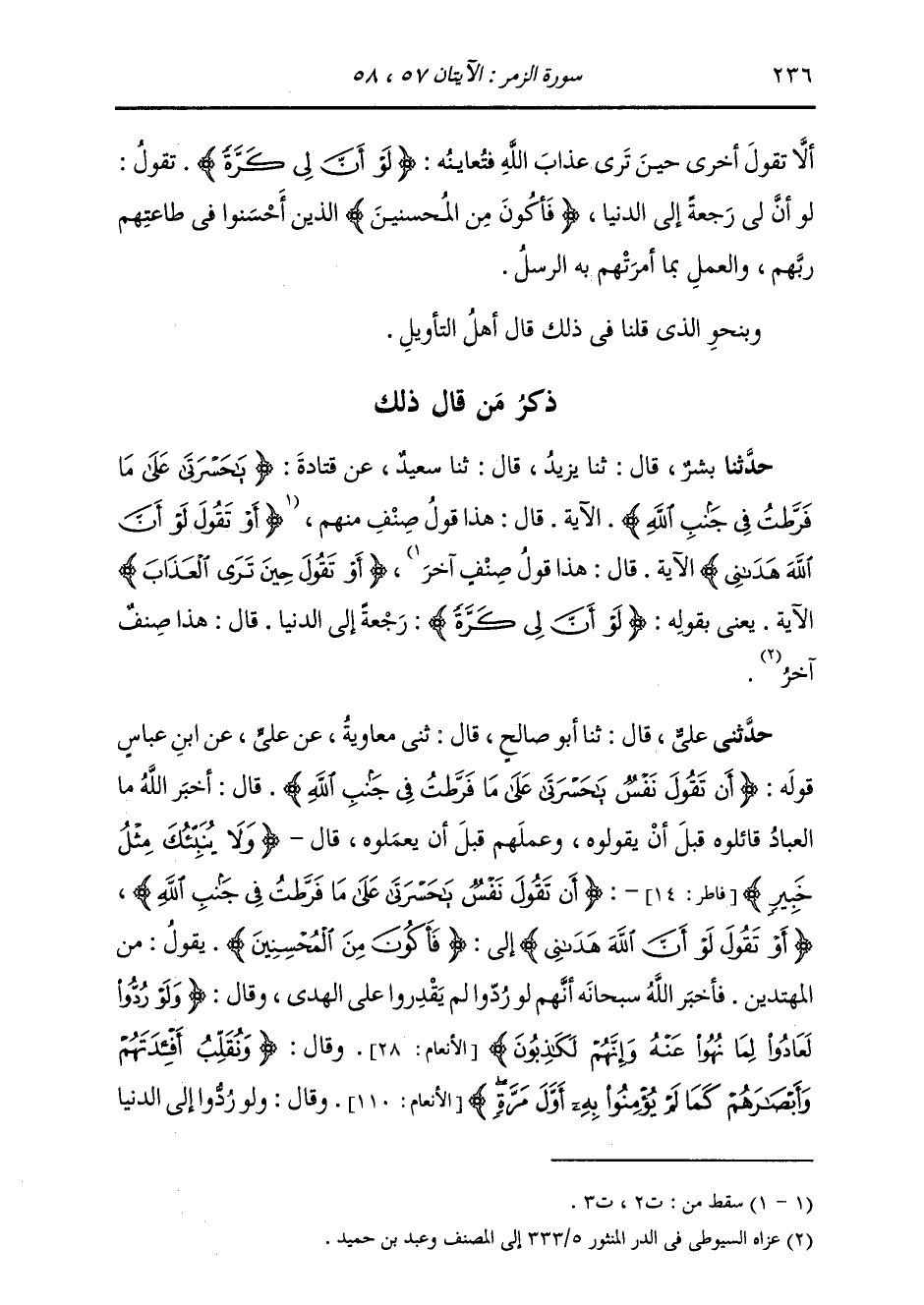 حَدَّثَنِي عَلِيٌّ، قَالَ: ثنا أَبُو صَالِحٍ، قَالَ: ثني مُعَاوِيَةُ، عَنْ عَلِيٍّ، عَنِ ابْنِ عَبَّاسٍ، قَوْلُهُ: {§أَنْ تَقُولَ نَفْسٌ يَا حَسْرَتَا عَلَى مَا فَرَّطْتُ فِي جَنْبِ اللَّهِ} قَالَ: " أَخْبَرَ اللَّهُ مَا الْعِبَادُ قَائِلُوهُ قَبْلَ أَنْ يَقُولُوهُ، وَعَمَلَهُمْ قَبْلَ أَنْ يَعْمَلُوهُ، قَالَ: {وَلَا يُنْبِئُكَ مِثْلُ خَبِيرٍ} [فاطر: 14] {أَنْ تَقُولَ نَفْسٌ يَا حَسْرَتَا عَلَى مَا فَرَّطْتُ فِي جَنْبِ اللَّهِ أَوْ تَقُولَ لَوْ أَنَّ اللَّهَ هَدَانِي} إِلَى قَوْلِهِ: {فَأَكُونَ مِنَ الْمُحْسِنِينَ} [الزمر: 58] يَقُولُ: مِنَ الْمُهْتَدِينَ، فَأَخْبَرَ اللَّهُ سُبْحَانَهُ أَنَّهُمْ لَوْ رُدُّوا لَمْ يَقْدِرُوا عَلَى الْهُدَى، وَقَالَ {وَلَوْ رُدُّوا لَعَادُوا لِمَا نُهُوا عَنْهُ وَإِنَّهُمْ لَكَاذِبُونَ} [الأنعام: 28] وَقَالَ: {وَنُقَلِّبُ أَفْئِدَتَهُمْ وَأَبْصَارَهُمْ} [الأنعام: 110] كَمَا لَمْ يُؤْمِنُوا بِهِ أَوَّلَ مَرَّةٍ، قَالَ: وَلَوْ رُدُّوا إِلَى الدُّنْيَا -[237]- لَحِيلَ بَيْنَهُمْ وَبَيْنَ الْهُدَى، كَمَا حِلْنَا بَيْنَهُمْ وَبَيْنَهُ أَوَّلَ مَرَّةٍ وَهُمْ فِي الدُّنْيَا " وَفِي نَصْبِ قَوْلِهِ {فَأَكُونَ} [الزمر: 58] وَجْهَانِ: أَحَدُهُمَا: أَنْ يَكُونَ نَصْبُهُ عَلَى أَنَّهُ جَوَابُ لَوْ وَالثَّانِي: عَلَى الرَّدِّ عَلَى مَوْضِعِ الْكَرَّةِ وَتَوْجِيهُ الْكَرَّةِ فِي الْمَعْنَى إِلَى: لَوْ أَنَّ لِيَ أَنْ أَكَرَّ، كَمَا قَالَ الشَّاعِرُ: