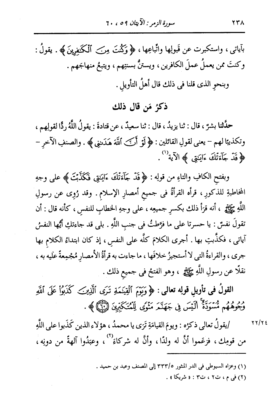 ذِكْرُ مَنْ قَالَ ذَلِكَ: حَدَّثَنَا بِشْرٌ، قَالَ: ثنا يَزِيدُ، قَالَ: ثنا سَعِيدٌ، عَنْ قَتَادَةَ: " §يَقُولُ اللَّهُ رَدًّا لِقَوْلِهِمْ، وَتَكْذِيبًا لَهُمْ، يَعْنِي لِقَوْلِ الْقَائِلِينَ: {لَوْ أَنَّ اللَّهَ هَدَانِي} [الزمر: 57] ، وَالصِنْفِ الْآخَرِ: {بَلَى قَدْ جَاءَتْكَ آيَاتِي} [الزمر: 59] الْآيَةَ " وَبِفَتْحِ الْكَافِ وَالتَّاءِ مِنْ قَوْلِهِ {قَدْ جَاءَتْكَ آيَاتِي فَكَذَبْتَ} [الزمر: 59] عَلَى وَجْهِ الْمُخَاطَبَةِ لِلذُّكُورِ، قَرَأَهُ الْقُرَّاءُ فِي جَمِيعِ أَمْصَارِ الْإِسْلَامِ وَقَدْ رُوِيَ عَنْ رَسُولِ اللَّهِ صَلَّى اللهُ عَلَيْهِ وَسَلَّمَ أَنَّهُ قَرَأَ ذَلِكَ بِكَسْرِ جَمِيعِهِ عَلَى وَجْهِ الْخِطَابِ لِلنَّفْسِ، كَأَنَّهُ قَالَ: أَنْ تَقُولَ نَفْسٌ: يَا حَسْرَتَا عَلَى مَا فَرَّطْتُ فِي جَنْبِ اللَّهِ، بَلَى قَدْ جَاءَتْكِ أَيَّتُهَا النَّفْسُ آيَاتِي، فَكَذَبْتِ بِهَا، أَجْرَى الْكَلَامَ كُلَّهُ عَلَى النَّفْسِ، إِذْ كَانَ ابْتِدَاءُ الْكَلَامِ بِهَا جَرَى، وَالْقِرَاءَةُ الَّتِي لَا أَسْتَجِيزُ خِلَافَهَا، مَا جَاءَتْ بِهِ قُرَّاءُ الْأَمْصَارِ مُجْمِعَةً عَلَيْهِ، نَقْلًا عَنْ رَسُولِ اللَّهِ صَلَّى اللهُ عَلَيْهِ وَسَلَّمَ، وَهُوَ الْفَتْحُ فِي جَمِيعِ ذَلِكَ