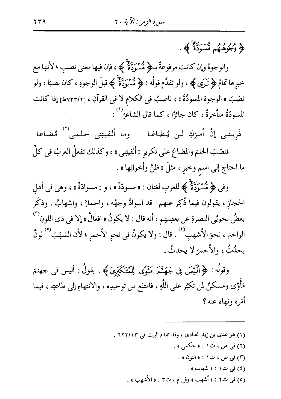{وَجُوهُهُمْ مُسْوَدَّةٌ} [الزمر: 60] ؛ وَالْوُجُوهُ وَإِنْ كَانَتْ مَرْفُوعَةً بِمُسْوَدَّةٌ، فَإِنَّ فِيهَا مَعْنَى نَصْبٍ، لِأَنَّهَا مَعَ خَبَرِهَا تَمَامُ تَرَى وَلَوْ تَقَدَّمَ قَوْلُهُ مُسْوَدَّةٌ قَبْلَ الْوجُوهِ، كَانَ نَصْبًا، وَلَوْ نَصَبَ الْوجُوهَ الْمُسْوَدَّةَ نَاصِبٌ فِي الْكَلَامِ لَا فِي الْقُرْآنِ، إِذَا كَانَتِ الْمُسْوَدَّةُ مُؤْخِرَةً كَانَ جَائِزًا، كَمَا قَالَ الشَّاعِرُ: