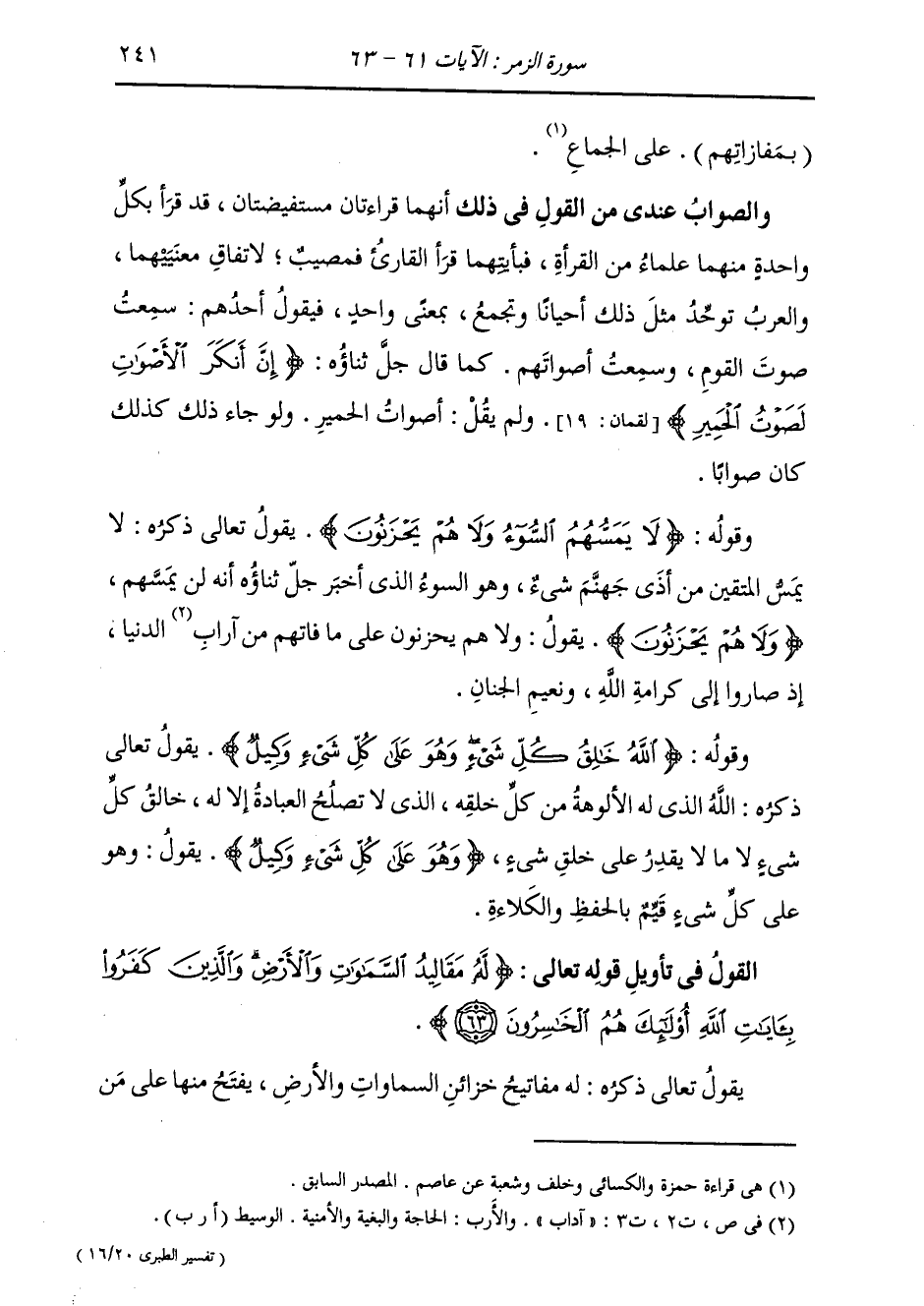 : (بِمَفَازَاتِهِمْ) عَلَى الْجِمَاعِ وَالصَّوَابُ عِنْدِي مِنَ الْقَوْلِ فِي ذَلِكَ أَنَّهُمَا قِرَاءَتَانِ مُسْتَفِيضَتَانِ، قَدْ قَرَأَ بِكُلِّ وَاحِدَةٍ مِنْهُمَا عُلَمَاءُ مِنَ الْقُرَّاءِ فَبِأَيَّتِهِمَا قَرَأَ الْقَارِئُ فَمُصِيبٌ، لِاتِّفَاقِ مَعْنَيَيْهِمَا؛ وَالْعَرَبُ تُوَحِّدُ مِثْلَ ذَلِكَ أَحْيَانًا وَتَجْمَعُ بِمَعْنًى وَاحِدٍ، فَيَقُولُ أَحَدُهُمْ: سَمِعْتُ صَوْتَ الْقَوْمِ، وَسَمِعْتُ أَصْوَاتَهُمُ، كَمَا قَالَ جَلَّ ثَنَاؤُهُ: {إِنَّ أَنْكَرَ الْأَصْوَاتِ لَصَوْتُ الْحَمِيرِ} [لقمان: 19] ، وَلَمْ يَقُلْ: أَصْوَاتُ الْحَمِيرِ، وَلَوْ جَاءَ ذَلِكَ كَذَلِكَ كَانَ صَوَابًا