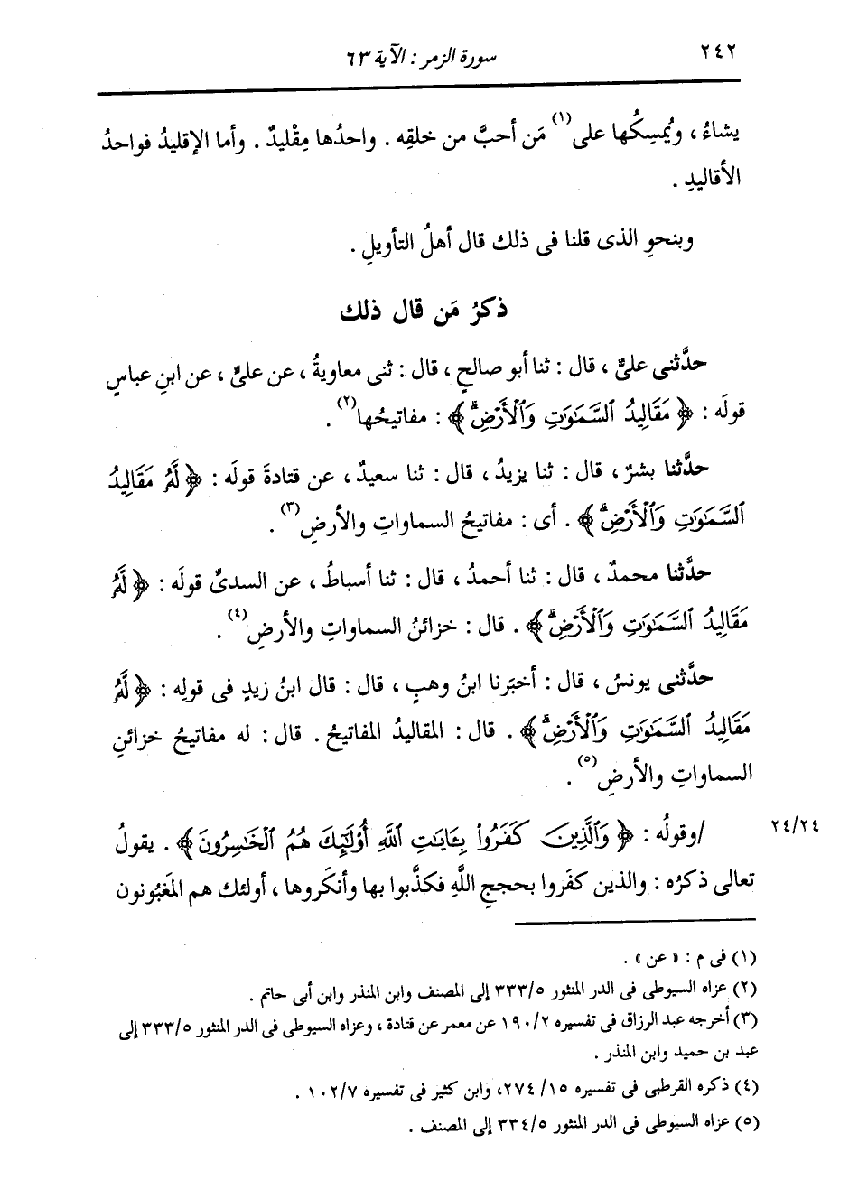 حَدَّثَنَا مُحَمَّدٌ، قَالَ: ثنا أَحْمَدُ، قَالَ: ثنا أَسْبَاطٌ، عَنِ السُّدِّيِّ، قَوْلُهُ: {§لَهُ مَقَالِيدُ السَّمَوَاتِ وَالْأَرْضِ} قَالَ: «خَزَائِنُ السَّمَوَاتِ وَالْأَرْضِ»