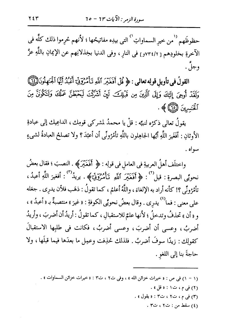 §الْقَوْلُ فِي تَأْوِيلِ قَوْلِهِ تَعَالَى: {قُلْ أَفَغَيْرُ اللَّهِ تَأْمُرُونِّي أَعْبُدُ أَيُّهَا الْجَاهِلُونَ وَلَقَدْ أُوحِيَ إِلَيْكَ وَإِلَى الَّذِينَ مِنْ قَبْلِكَ لَئِنْ أَشْرَكْتَ لَيَحْبَطَنَّ عَمَلُكَ وَلَتَكُونَنَّ مِنَ الْخَاسِرِينَ} [الزمر: 65] يَقُولُ تَعَالَى ذِكْرُهُ لِنَبِيِّهِ: قُلْ يَا مُحَمَّدُ لِمُشْرِكِي قَوْمِكَ، الدَّاعِيكَ إِلَى عِبَادَةِ الْأَوْثَانِ: {أَفَغَيْرَ اللَّهِ} [الأنعام: 114] أَيُّهَا الْجَاهِلُونَ بِاللَّهِ {تَأْمُرُونِّيَ} [الزمر: 64] أَنْ {أَعْبُدُ} [الأنعام: 56] وَلَا تَصْلُحُ الْعِبَادَةُ لِشَيْءٍ سِوَاهُ وَاخْتَلَفَ أَهْلُ الْعَرَبِيَّةِ فِي الْعَامِلِ، فِي قَوْلِهِ {أَفَغَيْرَ} [آل عمران: 83] النَّصْبَ، فَقَالَ بَعْضُ نَحْوِيِّي الْبَصْرَةِ: قُلْ أَفَغَيْرَ اللَّهِ تَأْمُرُونِّي، يَقُولُ: أَفَغَيْرَ اللَّهِ أَعْبُدُ تَأْمُرُونِّي، كَأَنَّهُ أَرَادَ الْإِلْغَاءَ، وَاللَّهُ أَعْلَمُ، كَمَا تَقُولُ: ذَهَبَ فَلَأَنٌ يَدْرِي، جَعَلَهُ عَلَى مَعْنَى فَمَا يَدْرِي وَقَالَ بَعْضُ نَحْوِيِّي الْكُوفَةِ: غَيْرَ مُنْتَصِبَةٌ بِأَعْبُدُ، وَأَنْ تُحْذَفُ وَتُدْخَلُ، لِأَنَّهَا عَلَمٌ لِلِاسْتِقْبَالِ، كَمَا تَقُولُ: أُرِيدُ أَنْ أَضْرِبَ، وَأُرِيدُ أَضْرِبَ، وَعَسَى أَنْ أَضْرِبَ، وَعَسَى أَضْرِبَ، فَكَانَتْ فِي طَلَبِهَا الِاسْتِقْبَالَ، كَقَوْلِكَ: زَيْدًا سَوْفَ أَضْرِبُ، فَلِذَلِكَ حُذِفَتْ وَعَمِلَ مَا بَعْدَهَا فِيمَا قَبْلَهَا، وَلَا حَاجَةَ بِنَا إِلَى اللَّغْوِ