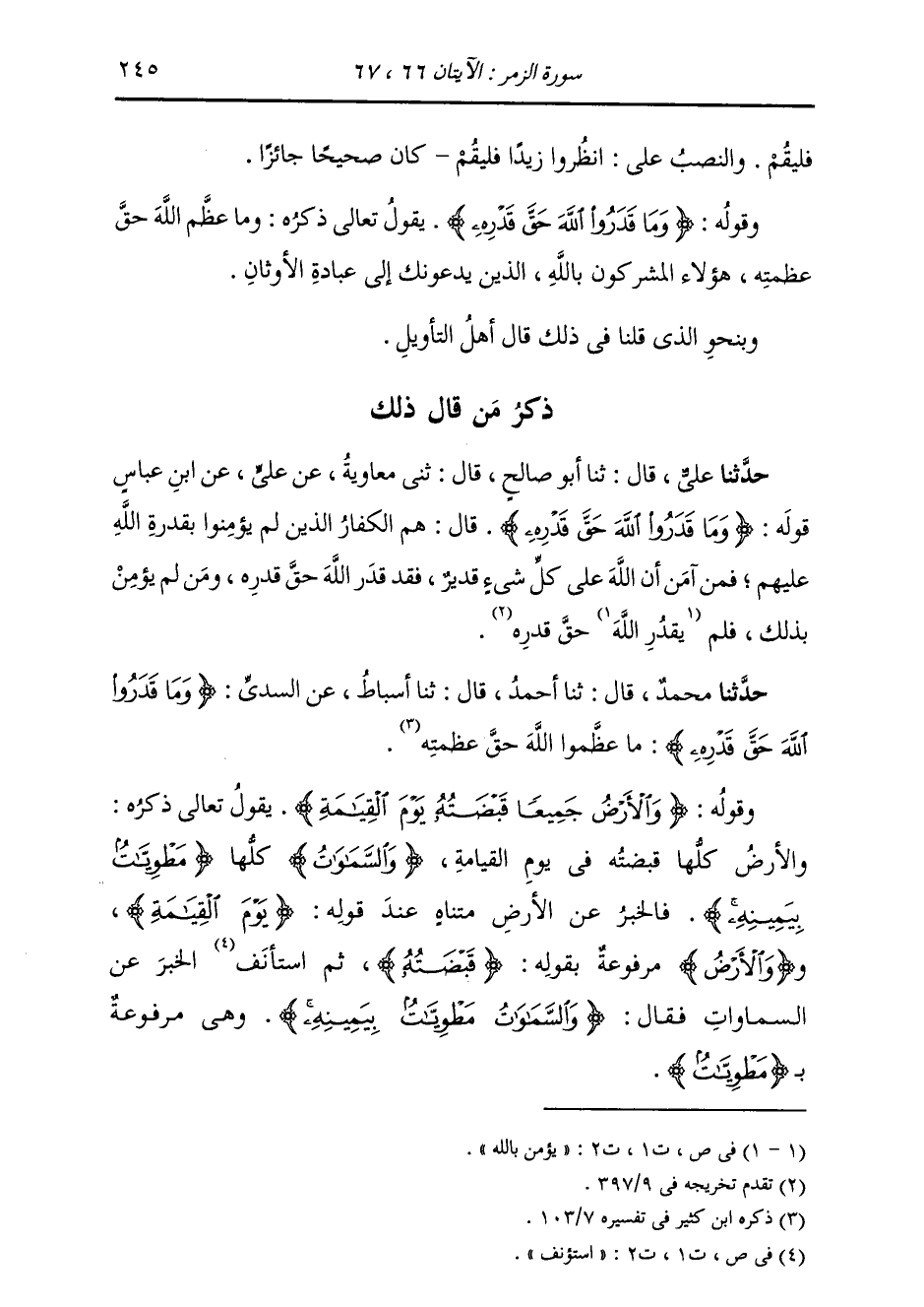 §وَقَوْلُهُ: {وَالْأَرْضُ جَمِيعًا قَبْضَتُهُ يَوْمَ الْقِيَامَةِ} [الزمر: 67] يَقُولُ تَعَالَى ذِكْرُهُ: وَالْأَرْضُ كُلُّهَا قَبْضَتُهُ فِي يَوْمِ الْقِيَامَةِ {وَالسَّمَوَاتُ} كُلُّهَا {مَطْوِيَّاتٌ بِيَمِينِهِ} [الزمر: 67] فَالْخَبَرُ عَنِ الْأَرْضِ مُتَنَاهٍ عِنْدَ قَوْلِهِ: يَوْمَ الْقِيَامَةِ، وَالْأَرْضُ مَرْفُوعَةٌ بِقَوْلِهِ {قَبْضَتُهُ} [الزمر: 67] ، ثُمَّ اسْتَأْنَفَ الْخَبَرَ عَنِ السَّمَوَاتِ، فَقَالَ: {وَالسَّمَوَاتُ مَطْوِيَّاتٌ بِيَمِينِهِ} وَهِيَ مَرْفُوعَةٌ بِمَطْوِيَّاتٍ -[246]- وَرُوِي عَنِ ابْنِ عَبَّاسٍ وَجَمَاعَةٍ غَيْرِهِ أَنَّهُمْ كَانُوا يَقُولُونَ: الْأَرْضُ وَالسَّمَوَاتُ جَمِيعًا فِي يَمِينِهِ يَوْمَ الْقِيَامَةِ