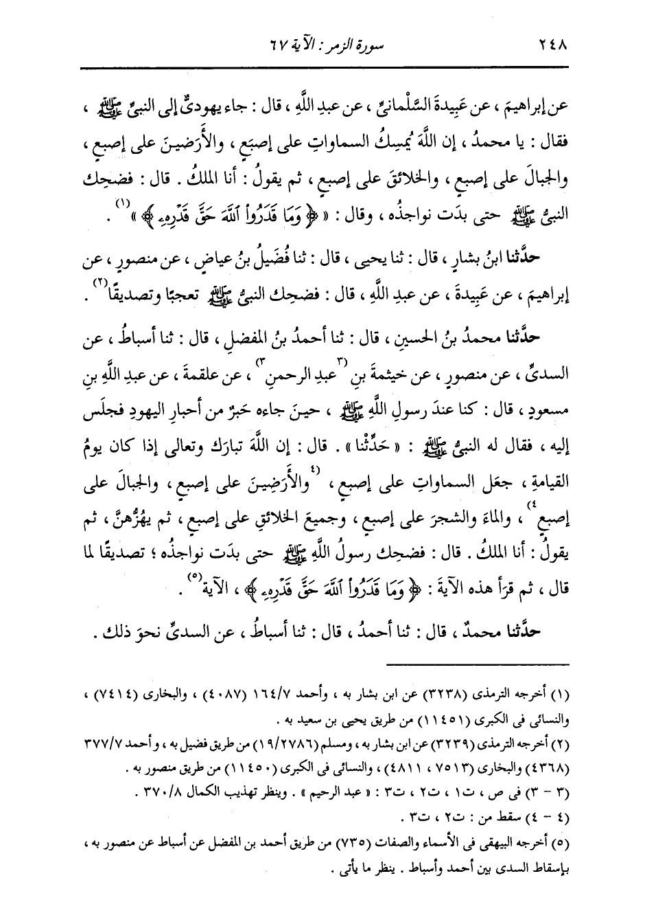 حَدَّثَنَا مُحَمَّدُ بْنُ الْحُسَيْنِ، قَالَ: ثنا أَحْمَدُ بْنُ الْمُفَضَّلِ، قَالَ: ثنا أَسْبَاطٌ، عَنِ السُّدِّيِّ، عَنْ مَنْصُورٍ، عَنْ خَيْثَمَةَ بْنِ عَبْدِ الرَّحْمَنِ، عَنْ عَلْقَمَةَ، عَنْ عَبْدِ اللَّهِ بْنِ مَسْعُودٍ، قَالَ: كُنَّا عِنْدَ رَسُولِ اللَّهِ صَلَّى اللهُ عَلَيْهِ وَسَلَّمَ، حِينَ جَاءَهُ حَبْرٌ مِنْ أَحْبَارِ الْيَهُودِ، فَجَلَسَ إِلَيْهِ، فَقَالَ لَهُ النَّبِيُّ صَلَّى اللهُ عَلَيْهِ وَسَلَّمَ: «حَدِّثْنَا» ، قَالَ: إِنَّ اللَّهَ تَبَارَكَ وَتَعَالَى إِذَا كَانَ يَوْمُ الْقِيَامَةِ، جَعَلَ السَّمَوَاتِ عَلَى أُصْبُعٍ، وَالْأَرَضِينَ عَلَى أُصْبُعٍ، وَالْجِبَالَ عَلَى أُصْبُعٍ، وَالْمَاءَ وَالشَّجَرَ عَلَى أُصْبُعٍ، وَجَمِيعَ الْخَلَائِقِ عَلَى أُصْبُعٍ ثُمَّ يَهُزُّهُنَّ ثُمَّ يَقُولُ: أَنَا الْمَلِكُ، قَالَ: " §فَضَحِكَ رَسُولُ اللَّهِ صَلَّى اللهُ عَلَيْهِ وَسَلَّمَ حَتَّى بَدَتْ نَوَاجِذُهُ تَصْدِيقًا لِمَا قَالَ، ثُمَّ قَرَأَ هَذِهِ الْآيَةَ: وَمَا قَدَرُوا اللَّهَ حَقَّ قَدْرِهِ الْآيَةَ " حَدَّثَنَا مُحَمَّدٌ، قَالَ: ثنا أَحْمَدُ، قَالَ: ثنا أَسْبَاطٌ، عَنِ السُّدِّيِّ، نَحْوُ ذَلِكَ