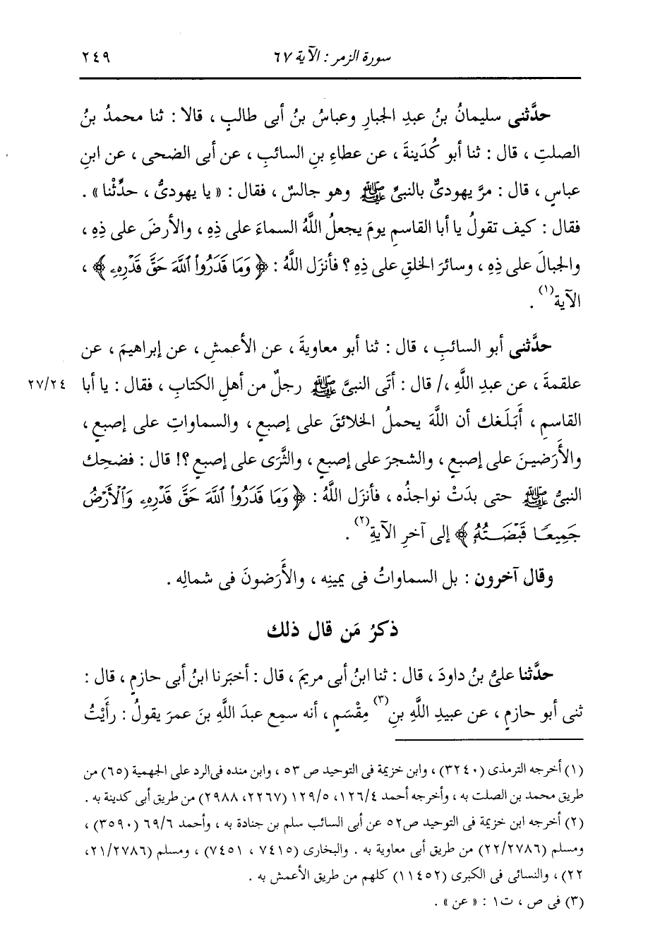 حَدَّثَنِي أَبُو السَّائِبِ، قَالَ: ثنا أَبُو مُعَاوِيَةَ، عَنِ الْأَعْمَشِ، عَنْ إِبْرَاهِيمَ، عَنْ عَلْقَمَةَ، عَنْ عَبْدِ اللَّهِ، قَالَ: أَتَى النَّبِيُّ صَلَّى اللهُ عَلَيْهِ وَسَلَّمَ رَجُلٌ مِنْ أَهْلِ الْكِتَابِ، فَقَالَ: يَا أَبَا الْقَاسِمِ أَبَلَغَكَ أَنَّ اللَّهَ يَحْمِلُ الْخَلَائِقَ عَلَى أُصْبُعٍ، وَالسَّمَوَاتَ عَلَى أُصْبُعٍ، وَالْأَرَضِينَ عَلَى أُصْبُعٍ، وَالشَّجَرَ عَلَى أُصْبُعٍ، وَالثَّرَى عَلَى أُصْبُعٍ؟ قَالَ §فَضَحِكَ النَّبِيُّ صَلَّى اللهُ عَلَيْهِ وَسَلَّمَ حَتَّى بَدَتْ نَوَاجِذُهُ، فَأَنْزَلَ اللَّهُ {وَمَا قَدَرُوا اللَّهَ حَقَّ قَدْرِهِ وَالْأَرْضُ جَمِيعًا قَبْضَتُهُ} [الزمر: 67] إِلَى آخِرِ الْآيَةِ " وَقَالَ آخَرُونَ: بَلِ السَّمَوَاتُ فِي يَمِينِهِ، وَالْأَرَضُونَ فِي شِمَالِهِ