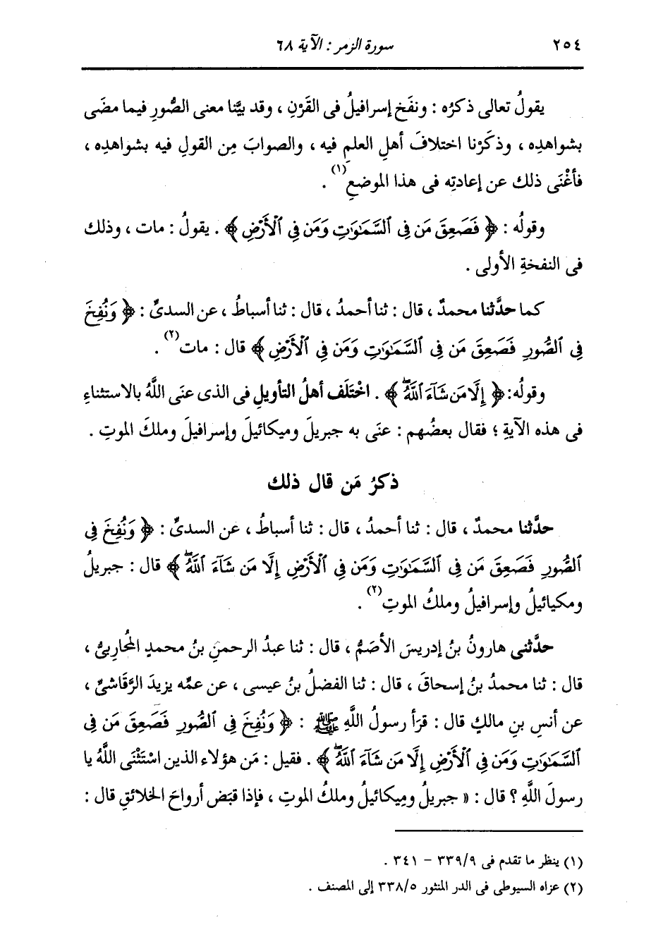 ذِكْرُ مَنْ قَالَ ذَلِكَ: حَدَّثَنَا مُحَمَّدٌ، قَالَ: ثنا أَحْمَدُ، قَالَ: ثنا أَسْبَاطٌ، عَنِ السُّدِّيِّ، {§وَنُفِخَ فِي الصُّورِ} فَصَعِقَ مَنْ فِي السَّمَوَاتِ وَمَنْ فِي الْأَرْضِ إِلَّا مَنْ شَاءَ اللَّهُ قَالَ «جِبْرِيلُ وَمِيكَائِيلُ وَإِسْرَافِيلُ وَمَلَكُ الْمَوْتِ»