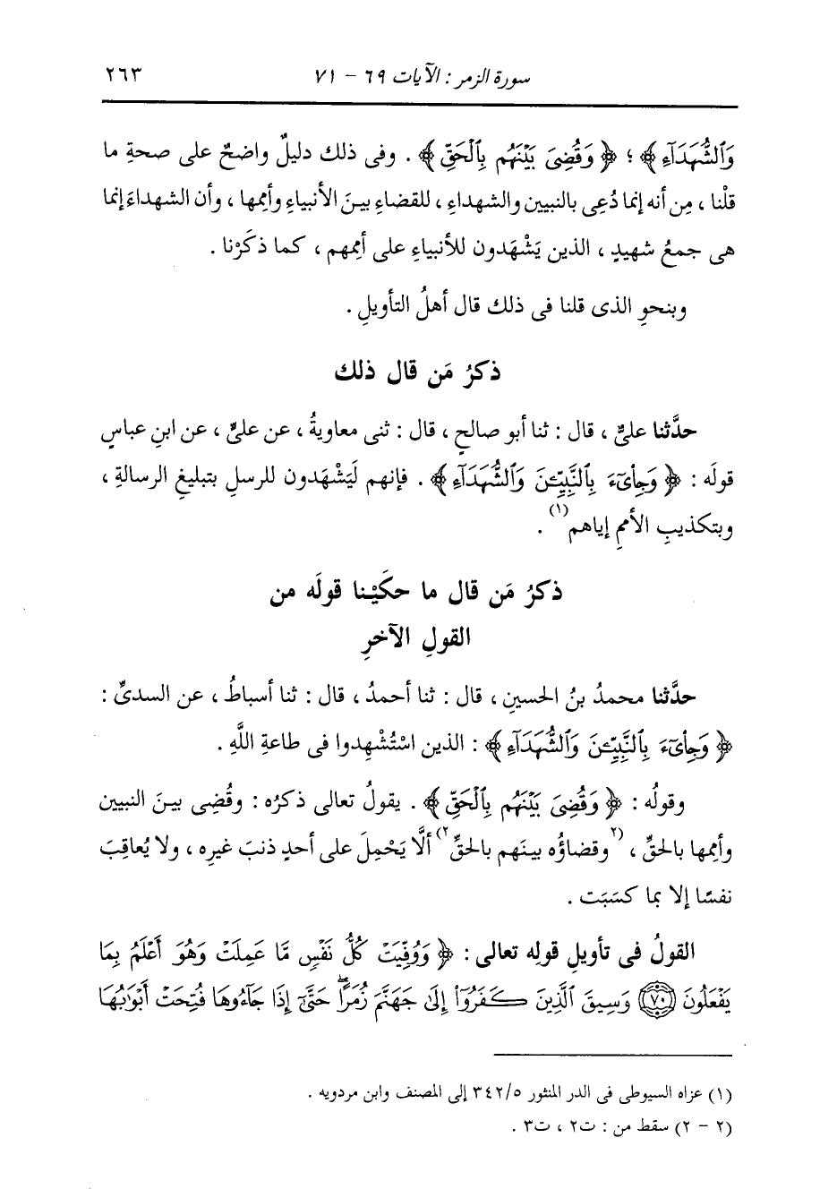 ذِكْرُ مَنْ قَالَ ذَلِكَ: حَدَّثَنَا عَلِيٌّ، قَالَ: ثنا أَبُو صَالِحٍ، قَالَ: ثني مُعَاوِيَةُ، عَنْ عَلِيٍّ، عَنِ ابْنِ عَبَّاسٍ، قَوْلُهُ {§وَجِيءَ بِالنَّبَيِّينَ وَالشُّهَدَاءِ} [الزمر: 69] «فَإِنَّهُمْ لَيَشْهَدُونَ لِلرُّسُلِ بِتَبْلِيغِ الرِّسَالَةِ، وَبِتَكْذِيبِ الْأُمَمِ إِيَّاهُمْ»
