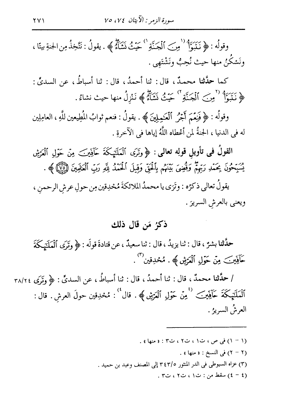 حَدَّثَنَا مُحَمَّدٌ، قَالَ: ثنا أَحْمَدُ، قَالَ: ثنا أَسْبَاطٌ، عَنِ السُّدِّيِّ، {§وَتَرَى الْمَلَائِكَةَ حَافِّينَ مِنْ حَوْلِ الْعَرْشِ} [الزمر: 75] قَالَ: " مُحْدِقِينَ حَوْلَ الْعَرْشِ، قَالَ: الْعَرْشُ: السَّرِيرُ "