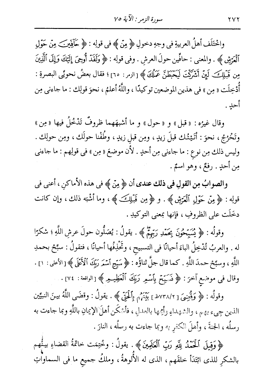 §وَقَوْلُهُ: {يُسَبِّحُونَ بِحَمْدِ رَبِّهِمْ} [الزمر: 75] يَقُولُ: يُصَلُّونَ حَوْلَ عَرْشِ اللَّهِ شُكْرًا لَهُ؛ وَالْعَرَبُ تُدْخِلُ الْبَاءَ أَحْيَانًا فِي التَّسْبِيحِ، وَتَحْذِفُهَا أَحْيَانًا، فَتَقُولُ: سَبِّحْ بِحَمْدِ اللَّهِ، وَسَبِّحْ حَمْدَ اللَّهِ، كَمَا قَالَ جَلَّ ثَنَاؤُهُ: {سَبِّحِ اسْمَ رَبِّكَ الْأَعْلَى} [الأعلى: 1] ، وَقَالَ فِي مَوْضِعٍ آخَرَ: {فَسَبِّحِ بِاسْمِ رَبِّكَ الْعَظِيمِ} [الواقعة: 74]