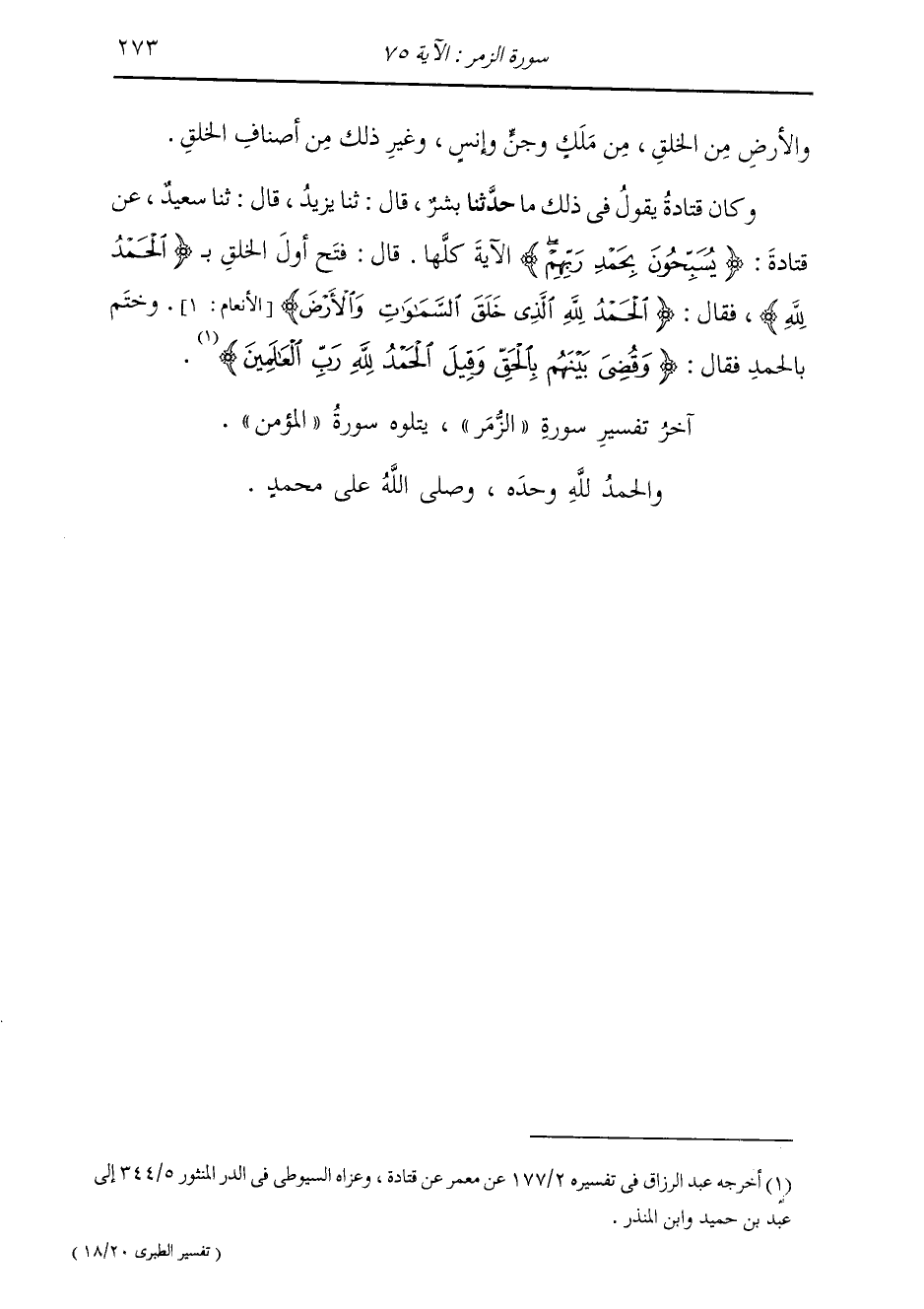 وَكَانَ قَتَادَةُ يَقُولُ فِي ذَلِكَ مَا: حَدَّثَنَا بِشْرٌ، قَالَ: ثنا يَزِيدُ، قَالَ: ثنا سَعِيدٌ، عَنْ قَتَادَةَ {§يُسَبِّحُونَ بِحَمْدِ رَبِّهِمْ} [الزمر: 75] الْآيَةَ كُلَّهَا قَالَ: " فُتِحَ أَوَّلُ الْخَلْقِ بِالْحَمْدِ لِلَّهِ، فَقَالَ: الْحَمْدُ لِلَّهِ الَّذِي خَلَقَ السَّمَوَاتِ وَالْأَرْضَ، وَخُتِمَ بِالْحَمْدِ " فَقَالَ: {وَقُضِيَ بَيْنَهُمْ بِالْحَقِّ وَقِيلَ الْحَمْدُ لِلَّهِ رَبِّ الْعَالَمِينَ} [الزمر: 75]