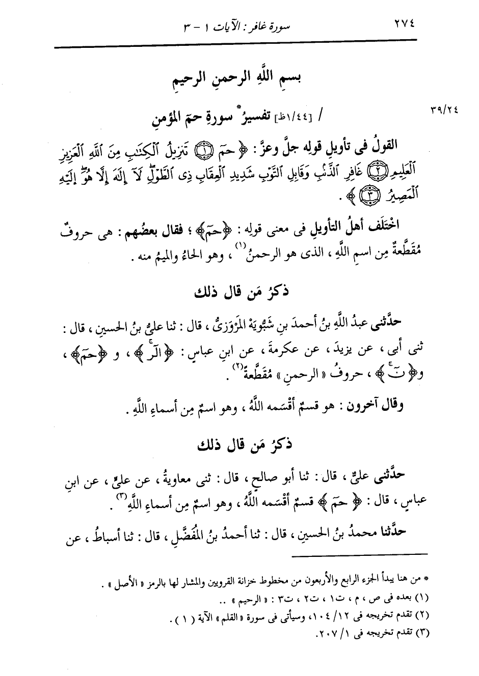 حَدَّثَنَا مُحَمَّدُ بْنُ الْحُسَيْنِ، قَالَ: ثنا أَحْمَدُ بْنُ الْمُفَضَّلِ، قَالَ: ثنا أَسْبَاطٌ، عَنِ -[275]- السُّدِّيِّ، قَوْلُهُ {§حم} [غافر: 1] «مِنْ حُرُوفِ أَسْمَاءِ اللَّهِ» وَقَالَ آخَرُونَ: بَلْ هُوَ اسْمٌ مِنْ أَسْمَاءِ الْقُرْآنِ