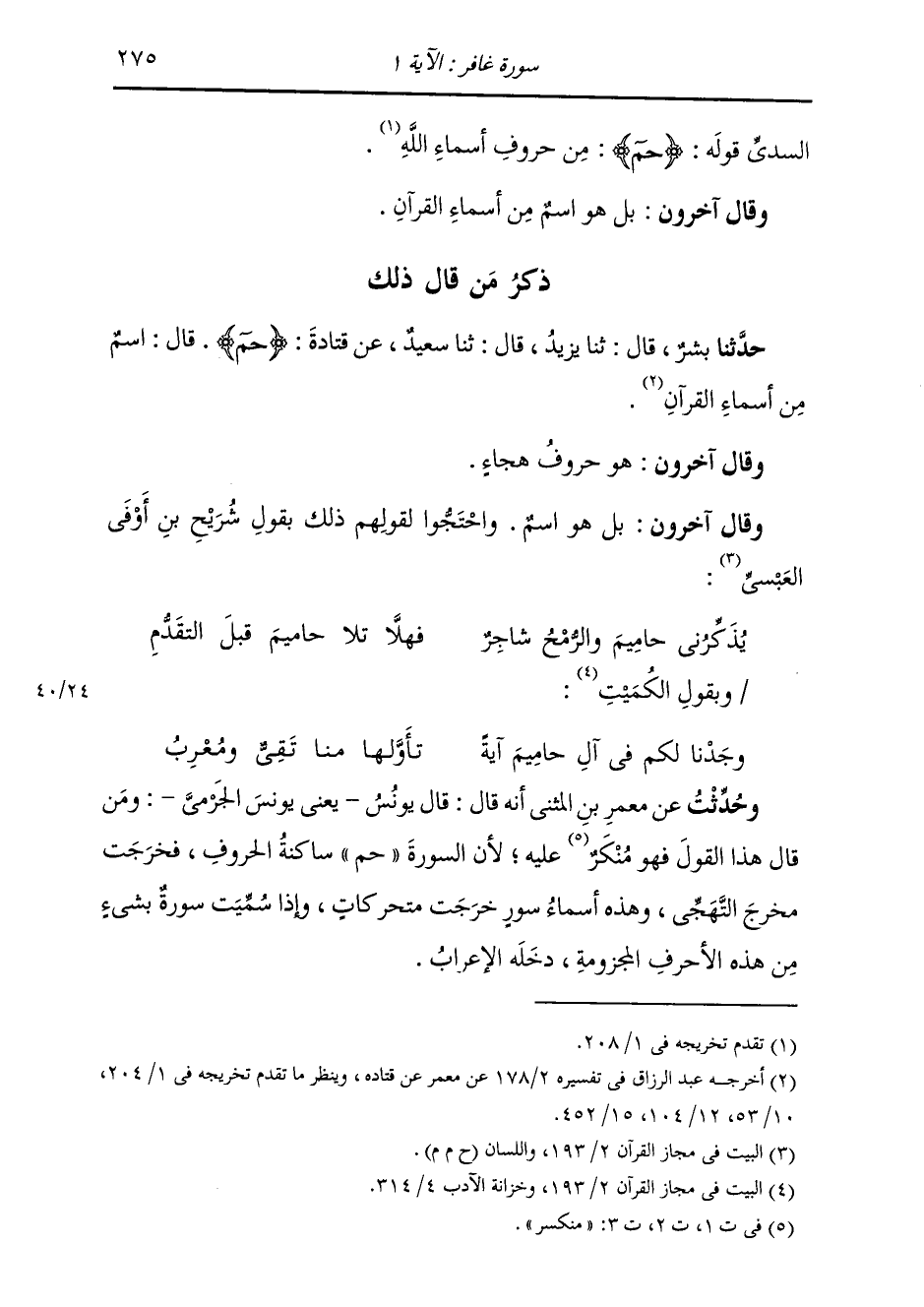 وَحُدِّثْتُ عَنْ مَعْمَرِ بْنِ الْمُثَنَّى، أَنَّهُ قَالَ: قَالَ يُونُسُ يَعْنِي الْجَرْمِيَّ: " وَمَنْ قَالَ هَذَا الْقَوْلَ فَهُوَ مُنْكَرٌ عَلَيْهِ، لِأَنَّ §السُّورَةَ {حم} [غافر: 1] سَاكِنَةُ الْحُرُوفِ، فَخَرَجَتْ مَخْرَجَ التَّهَجِّي، وَهَذِهِ أَسْمَاءُ سُوَرٍ خَرَجَتْ مُتَحَرِّكَاتٍ، وَإِذَا سُمِّيَتْ سُورَةٌ بِشَيْءٍ مِنْ هَذِهِ الْأَحْرُفِ الْمَجْزُومَةِ دَخَلَهُ الْإِعْرَابُ " -[276]- وَالْقَوْلُ فِي ذَلِكَ عِنْدِي نَظِيرُ الْقَوْلِ فِي أَخَوَاتِهَا، وَقَدْ بَيْنَا ذَلِكَ، فِي قَوْلِهِ: {الم} [البقرة: 1] فَفِي ذَلِكَ كِفَايَةٌ عَنْ إِعَادَتِهِ فِي هَذَا الْمَوْضِعِ، إِذْ كَانَ الْقَوْلُ فِي حم، وَجَمِيعِ مَا جَاءَ فِي الْقُرْآنِ عَلَى هَذَا الْوَجْهِ، أَعْنِي حُرُوفَ التَّهَجِّي قَوْلًا وَاحِدًا