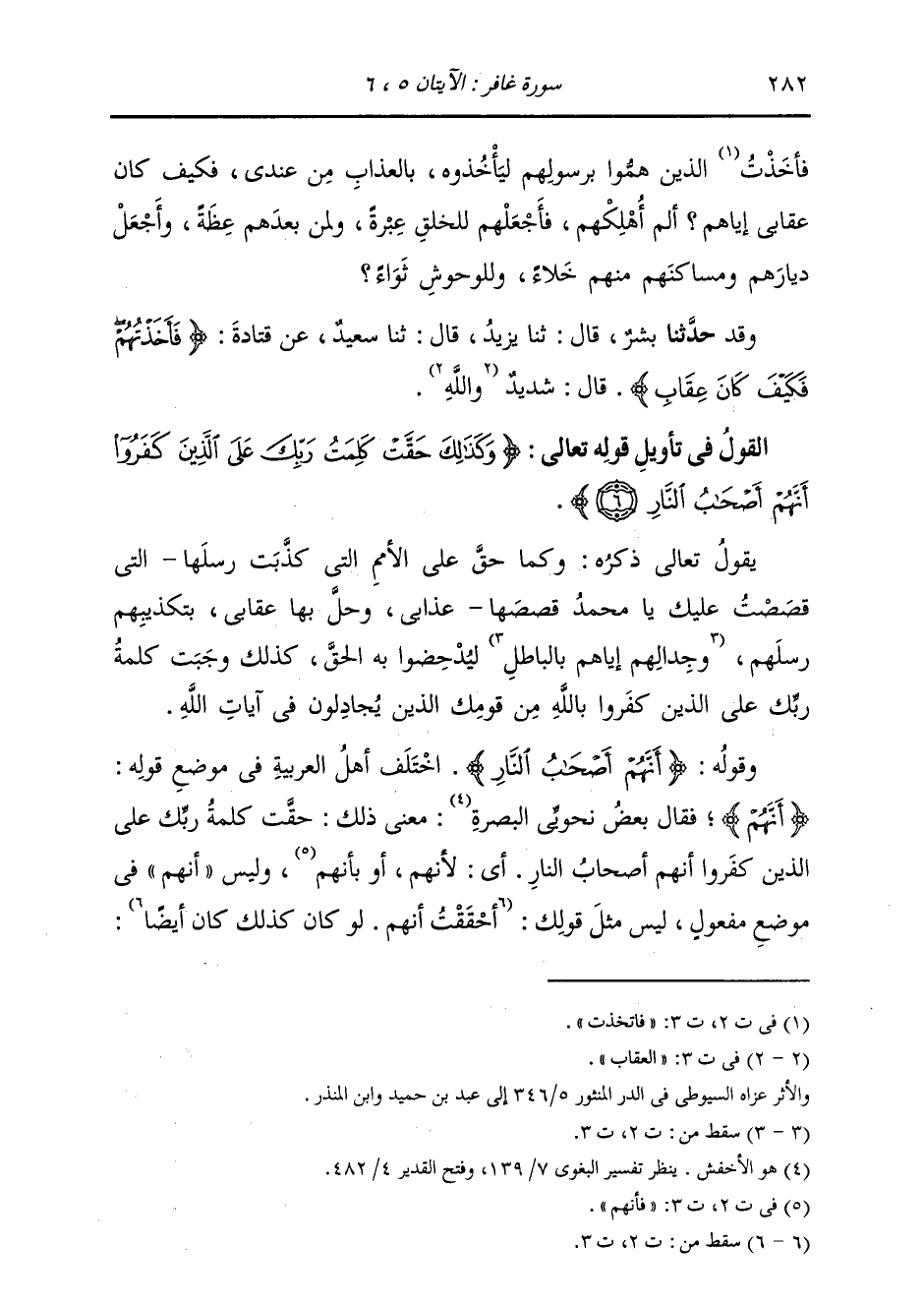 §وَقَوْلُهُ: {أَنَّهُمْ أَصْحَابُ النَّارِ} [غافر: 6] اخْتَلَفَ أَهْلُ الْعَرَبِيَّةِ فِي مَوْضِعِ قَوْلِهِ {أَنَّهُمْ} [البقرة: 46] فَقَالَ بَعْضُ نَحْوِيِّي الْبَصْرَةِ: مَعْنَى ذَلِكَ: حَقَّتْ كَلِمَةُ رَبِّكَ عَلَى الَّذِينَ كَفَرُوا أَنَّهُمْ أَصْحَابُ النَّارِ: أَيْ لِأَنَّهُمْ، أَوْ بِأَنَّهُمْ، وَلَيْسَ أَنَّهُمْ فِي مَوْضِعِ مَفْعُولٍ لَيْسَ مِثْلَ قَوْلِكَ: أَحَقَقَتْ أَنَّهُمْ لَوْ كَانَ كَذَلِكَ كَانَ أَيْضًا -[283]- أَحْقَقَتْ، لِأَنَّهُمْ. وَكَانَ غَيْرُهُ يَقُولُ: أَنَّهُمْ بَدَلٌ مِنَ الْكَلِمَةِ، كَأَنَّهُ أَحَقَّتِ الْكَلِمَةُ حَقًّا أَنَّهُمْ أَصْحَابُ النَّارِ وَالصَوَابُ مِنَ الْقَوْلِ فِي ذَلِكَ، أَنَّ قَوْلَهُ «أَنَّهُمْ» تَرْجَمَةٌ عَنِ الْكَلِمَةِ، بِمَعْنَى: وَكَذَلِكَ حَقَّ عَلَيْهِمْ عَذَابُ النَّارِ، الَّذِي وَعَدَ اللَّهُ أَهْلَ الْكُفْرِ بِهِ