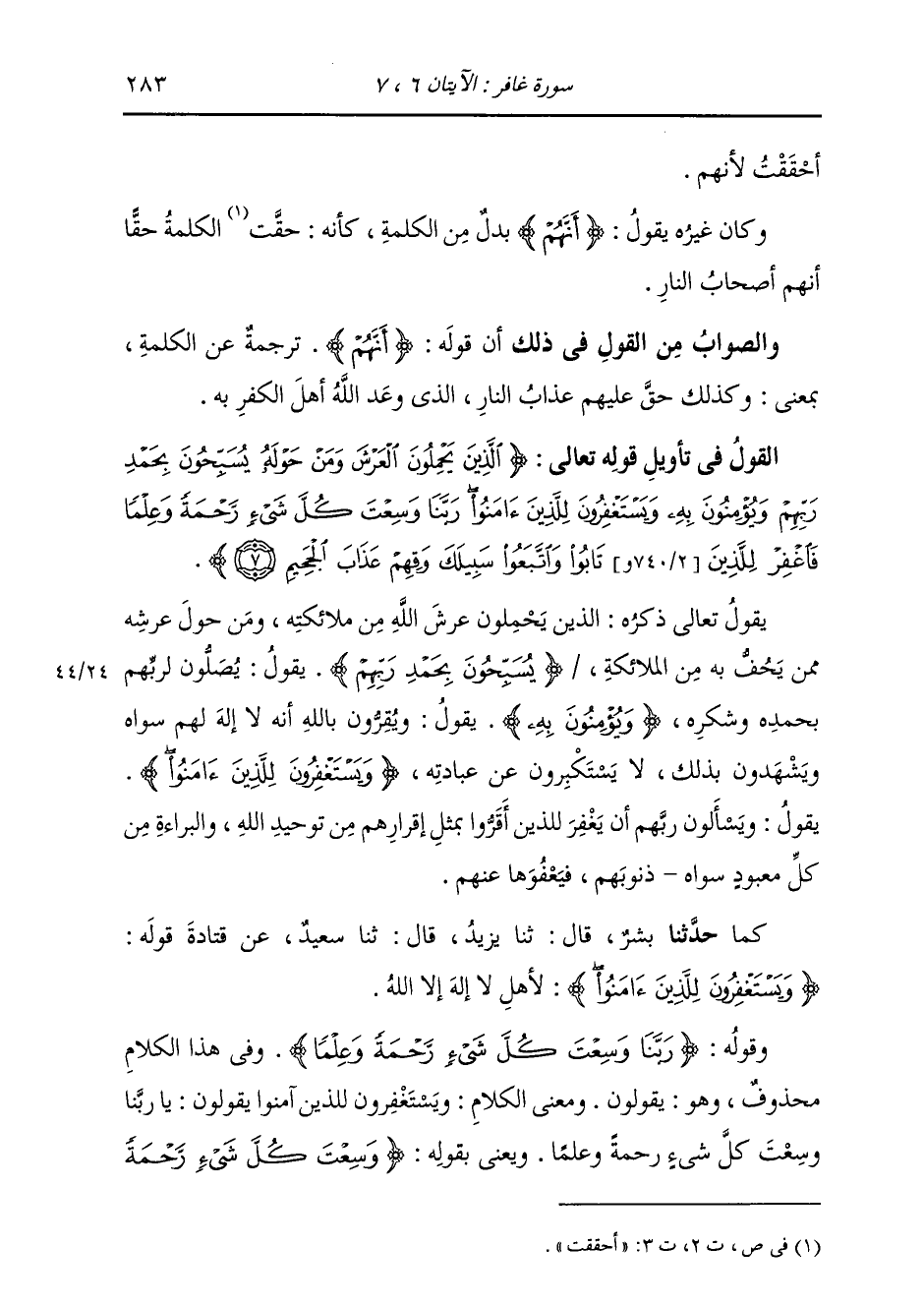 §الْقَوْلُ فِي تَأْوِيلِ قَوْلِهِ تَعَالَى. {الَّذِينَ يَحْمِلُونَ الْعَرْشَ وَمَنْ حَوْلَهَ يُسَبِّحُونَ بِحَمْدِ رَبِّهِمْ وَيُؤْمِنُونَ بِهِ وَيَسْتَغْفِرُونَ لِلَّذِينَ آمَنُوا رَبَّنَا وَسِعْتَ كُلَّ شَيْءٍ رَحْمَةً وَعِلْمًا فَاغْفِرْ لِلَّذِينَ تَابُوا وَاتَّبَعُوا سَبِيلَكَ وَقِهِمْ عَذَابَ الْجَحِيمِ} [غافر: 7] يَقُولُ تَعَالَى ذِكْرُهُ: الَّذِينَ يَحْمِلُونَ عَرْشَ اللَّهِ مِنْ مَلَائِكَتِهِ، وَمَنْ حَوْلَ عَرْشِهِ، مِمَّنْ يَحِفُّ بِهِ مِنَ الْمَلَائِكَةِ {يُسَبِّحُونَ بِحَمْدِ رَبِّهِمْ} [الزمر: 75] يَقُولُ: يُصَلُّونَ لِرَبِّهِمْ بِحَمْدِهِ وَشُكْرِهِ {وَيُؤْمِنُونَ بِهِ} [غافر: 7] يَقُولُ: وَيُقِرُّونَ بِاللَّهِ أَنَّهُ لَا إِلَهَ لَهُمْ سِوَاهُ، وَيَشْهَدُونَ بِذَلِكَ، لَا يَسْتَكْبِرُونَ عَنْ عِبَادَتِهِ {وَيَسْتَغْفِرُونَ لِلَّذِينَ آمَنُوا} [غافر: 7] يَقُولُ: وَيَسْأَلُونَ رَبَّهُمْ أَنْ يَغْفِرَ لِلَّذِينَ أَقَرُّوا بِمِثْلِ إِقْرَارِهِمْ مِنْ تَوْحِيدِ اللَّهِ، وَالْبَرَاءَةِ مِنْ كُلِّ مَعْبُودٍ سِوَاهُ ذُنُوبَهُمْ، فَيَعْفُوهَا عَنْهُمْ