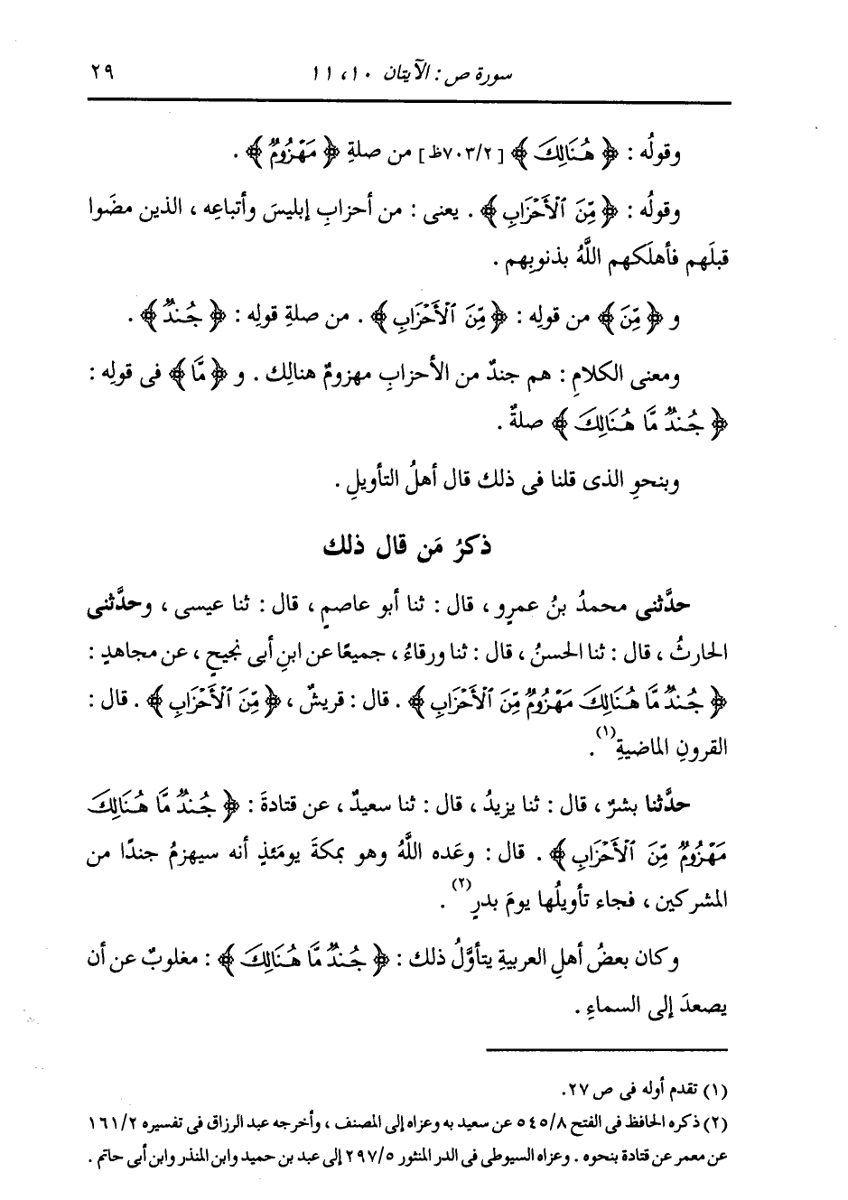ذِكْرُ مَنْ قَالَ ذَلِكَ: حَدَّثَنِي مُحَمَّدُ بْنُ عَمْرٍو، قَالَ: ثنا أَبُو عَاصِمٍ، قَالَ: ثنا عِيسَى، وَحَدَّثَنِي الْحَارِثُ، قَالَ: ثنا الْحَسَنُ، قَالَ: ثنا وَرْقَاءُ، جَمِيعًا عَنِ ابْنِ أَبِي نَجِيحٍ، عَنْ مُجَاهِدٍ، {§جُنْدٌ مَا هُنَالِكَ مَهْزُومٌ مِنَ الْأَحْزَابِ} [ص: 11] قَالَ: " قُرَيْشٌ مِنَ الْأَحْزَابِ، قَالَ: الْقُرُونُ الْمَاضِيَةُ "