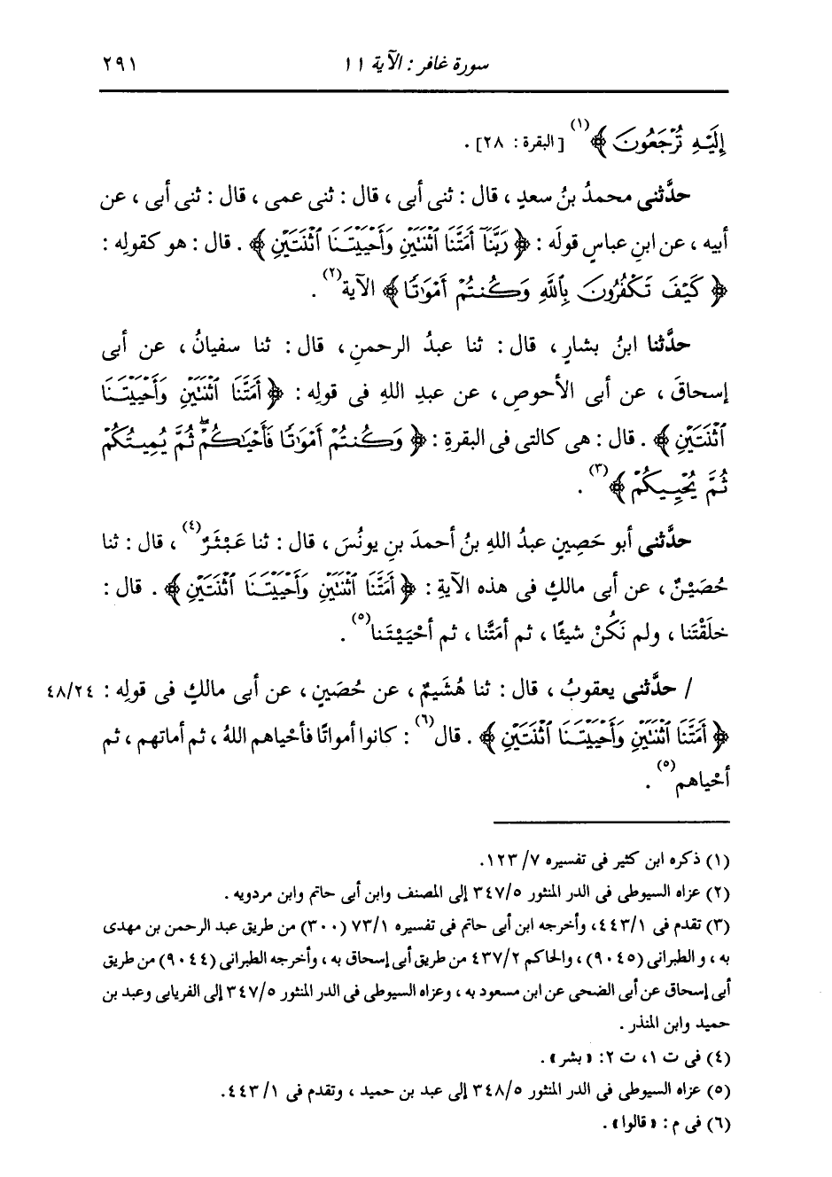 حَدَّثَنَا ابْنُ بَشَّارٍ، قَالَ: ثنا عَبْدُ الرَّحْمَنِ، قَالَ: ثنا سُفْيَانُ، عَنْ أَبِي إِسْحَاقَ، عَنْ أَبِي الْأَحْوَصِ، عَنْ عَبْدِ اللَّهِ، فِي قَوْلِهِ: {§أَمَتَّنَا اثْنَتَيْنِ وَأَحْيَيْتَنَا اثْنَتَيْنِ} [غافر: 11] قَالَ: " هِيَ كَالَّتِي فِي الْبَقَرَةِ {وَكُنْتُمْ أَمْوَاتًا فَأَحْيَاكُمْ ثُمَّ يُمِيتُكُمْ ثُمَّ يُحْيِيكُمْ} [البقرة: 28]