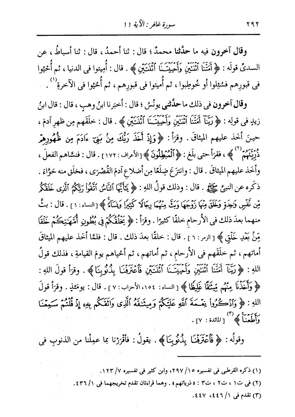 وَقَالَ آخَرُونَ فِيهِ مَا: حَدَّثَنَا مُحَمَّدٌ، قَالَ: ثنا أَحْمَدُ، قَالَ: ثنا أَسْبَاطٌ، عَنِ السُّدِّيِّ، قَوْلُهُ: {§أَمَتَّنَا اثْنَتَيْنِ وَأَحْيَيْتَنَا اثْنَتَيْنِ} [غافر: 11] قَالَ: «أُمِيتُوا فِي الدُّنْيَا، ثُمَّ أُحْيُوا فِي قُبُورِهِمْ، فَسُئِلُوا أَوْ خُوطِبُوا، ثُمَّ أُمِيتُوا فِي قُبُورِهِمْ، ثُمَّ أُحْيُوا فِي الْآخِرَةِ»