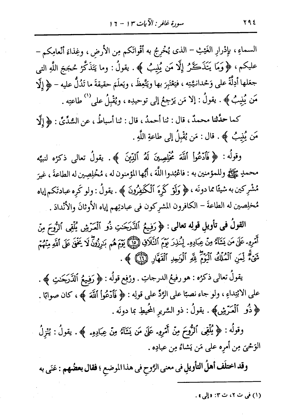 §وَقَوْلُهُ: {يُلْقِي الرُّوحَ مِنْ أَمْرِهِ عَلَى مَنْ يَشَاءُ مِنْ عِبَادِهِ} [غافر: 15] يَقُولُ: يُنَزِّلُ الْوَحْيَ مِنْ أَمْرِهِ عَلَى مَنْ يَشَاءُ مِنْ عِبَادِهِ وَقَدِ اخْتَلَفَ أَهْلُ التَّأْوِيلِ فِي مَعْنَى الرُّوحِ فِي هَذَا الْمَوْضِعِ، فَقَالَ بَعْضُهُمْ: عُنِيَ بِهِ -[295]- الْوَحْيُ