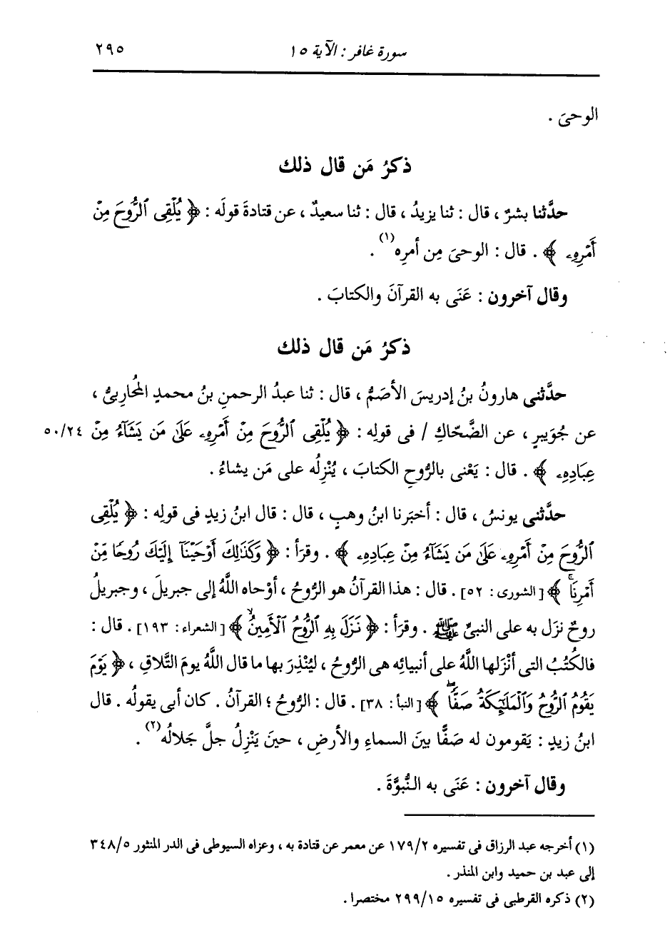 ذِكْرُ مَنْ قَالَ ذَلِكَ: حَدَّثَنَا بِشْرٌ، قَالَ: ثنا يَزِيدُ، قَالَ: ثنا سَعِيدٌ، عَنْ قَتَادَةَ، قَوْلُهُ: {§يُلْقِي الرُّوحَ مِنْ أَمْرِهِ} [غافر: 15] قَالَ: «الْوَحْيَ مِنْ أَمْرِهِ» وَقَالَ آخَرُونَ: عُنِيَ بِهِ الْقُرْآنُ وَالْكِتَابُ