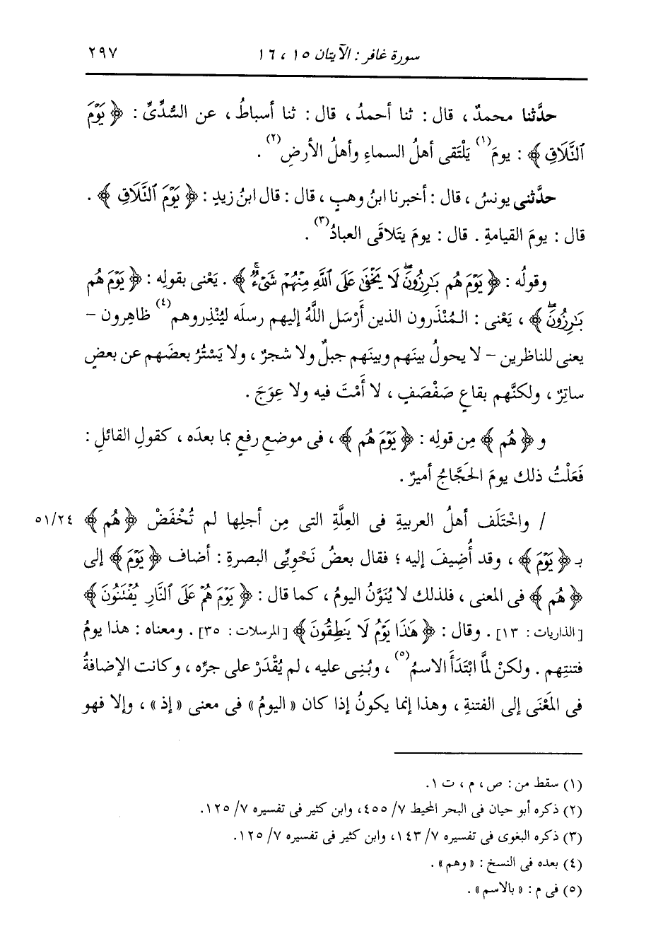 §وَقَوْلُهُ: {يَوْمَ هُمْ بَارِزُونَ لَا يَخْفَى عَلَى اللَّهِ مِنْهُمْ شَيْءٌ} [غافر: 16] يَعْنِي بِقَوْلِهِ {يَوْمَ هُمْ بَارِزُونَ} [غافر: 16] يَعْنِي الْمُنْذَرِينَ الَّذِينَ أَرْسَلَ اللَّهُ إِلَيْهِمْ رُسُلَهُ لِيُنْذِرُوهُمْ وَهُمْ ظَاهِرُونَ يَعْنِي لِلنَّاظِرِينَ لَا يَحُولُ بَيْنَهُمْ وَبَيْنَهُمْ جَبَلٌ وَلَا شَجَرٌ، وَلَا يَسْتُرُ بَعْضُهُمْ عَنْ بَعْضٍ سَاتِرٌ، وَلَكِنَّهُمْ بِقَاعٍ صَفْصَفٍ لَا أَمِتَ فِيهِ وَلَا عِوَجَ وَهُمْ مِنْ قَوْلِهِ: {يَوْمَ هُمْ} [غافر: 16] فِي مَوْضِعِ رَفْعٍ بِمَا بَعْدَهُ، كَقَوْلِ الْقَائِلِ: فَعَلْتُ ذَلِكَ يَوْمَ الْحَجَّاجُ أَمِيرٌ وَاخْتَلَفَ أَهْلُ الْعَرَبِيَّةِ فِي الْعِلَّةِ الَّتِي مِنْ أَجَلِهَا لَمْ تُخْفَضْ هُمْ بِيَوْمَ وَقَدْ أُضِيفَ إِلَيْهِ؟ فَقَالَ بَعْضُ نَحْوِيِّي الْبَصْرَةِ: أَضَافَ يَوْمَ إِلَى هُمْ فِي الْمَعْنَى، فَلِذَلِكَ لَا يُنَوَّنُ الْيَوْمُ، كَمَا قَالَ: {يَوْمَ هُمْ عَلَى النَّارِ يُفْتَنُونَ} [الذاريات: 13] وَقَالَ: {هَذَا يَوْمُ لَا يَنْطِقُونَ} [المرسلات: 35] وَمَعْنَاهُ: هَذَا يَوْمُ فِتْنَتِهِمْ، وَلَكِنْ لَمَّا ابْتَدَأَ بِالِاسْمِ، وَبَنَى عَلَيْهِ لَمْ يَقْدِرْ عَلَى جَرِّهِ، وَكَانَتِ الْإِضَافَةُ فِي الْمَعْنَى إِلَى الْفِتْنَةِ، وَهَذَا إِنَّمَا يَكُونُ إِذَا كَانَ الْيَوْمُ فِي مَعْنَى إِذْ، وَإِلَّا فَهُوَ