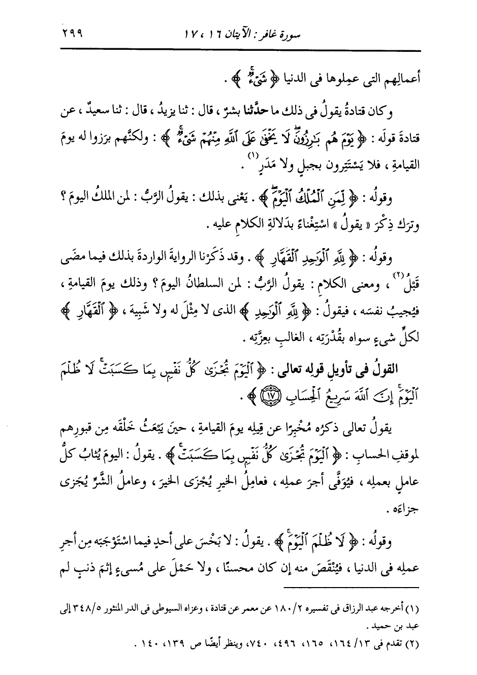 §وَقَوْلُهُ: {لِمَنِ الْمَلِكُ الْيَوْمَ} [غافر: 16] يَعْنِي بِذَلِكَ: يَقُولُ الرَّبُّ: لِمَنِ الْمَلِكُ الْيَوْمَ؛ وَتَرَكَ ذِكْرَ يَقُولُ اسْتِغْنَاءً بِدَلَالَةِ الْكَلَامِ عَلَيْهِ وَقَوْلُهُ: {لِلَّهِ الْوَاحِدِ الْقَهَّارِ} [إبراهيم: 48] وَقَدْ ذَكَرْنَا الرِّوَايَةَ الْوَارِدَةَ بِذَلِكَ فِيمَا مَضَى قَبْلُ؛ وَمَعْنَى الْكَلَامِ: يَقُولُ الرَّبُّ: لِمَنِ السُّلْطَانُ الْيَوْمَ؟ وَذَلِكَ يَوْمُ الْقِيَامَةِ، فَيُجِيبُ نَفْسَهُ فَيَقُولُ: {لِلَّهِ الْوَاحِدِ} [إبراهيم: 48] الَّذِي لَا مَثَلَ لَهُ وَلَا شَبِيهَ {الْقَهَّارِ} [يوسف: 39] لِكُلِّ شَيْءٍ سِوَاهُ بِقُدْرَتِهِ، الْغَالِبِ بِعِزَّتِهِ