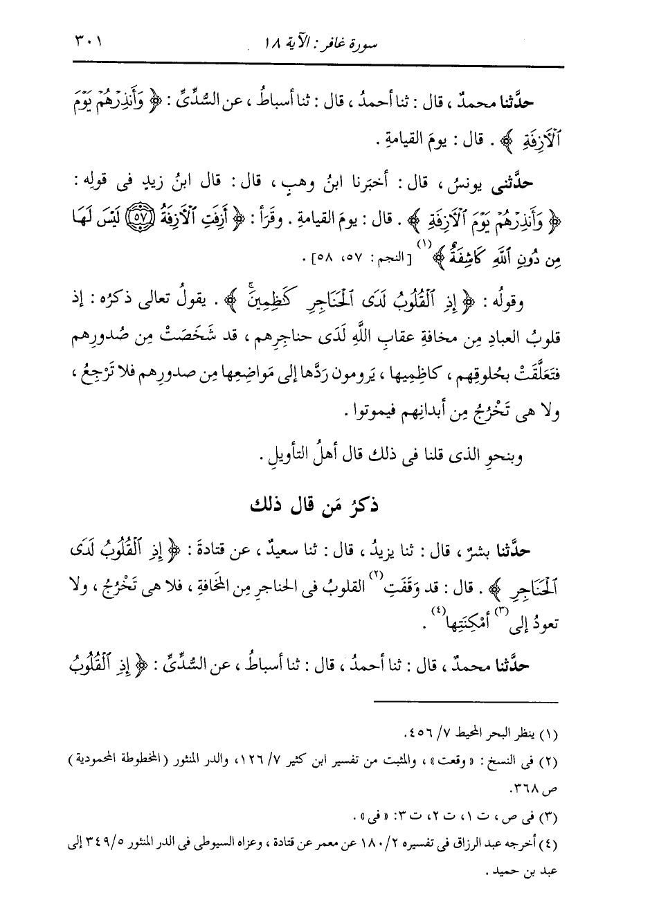 حَدَّثَنَا مُحَمَّدٌ، قَالَ: ثنا أَحْمَدُ، قَالَ: ثنا أَسْبَاطٌ، عَنِ السُّدِّيِّ، {§وَأَنْذِرْهُمْ يَوْمَ الْآزِفَةِ} [غافر: 18] قَالَ: «يَوْمَ الْقِيَامَةِ»