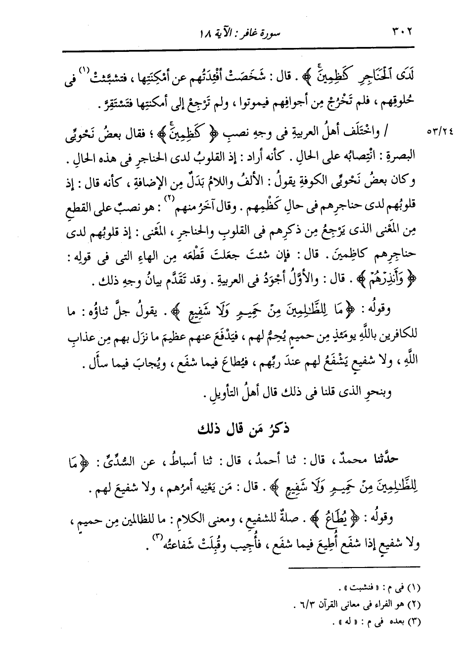 لَدَى الْحَنَاجِرِ كَاظِمِينَ} [غافر: 18] قَالَ: «شَخِصَتْ أَفْئِدَتُهُمْ عَنْ أَمْكِنَتِهَا، فَنَشَبَتْ فِي حُلُوقِهِمْ، فَلَمْ تَخْرُجْ مِنْ أَجْوَافِهِمْ فَيَمُوتُوا، وَلَمْ تَرْجِعْ إِلَى أَمْكِنَتِهَا فَتَسْتَقِرُّ» وَاخْتَلَفَ أَهْلُ الْعَرَبِيَّةِ فِي وَجْهِ النَّصْبِ {كَاظِمِينَ} [غافر: 18] فَقَالَ بَعْضُ نَحْوِيِّي الْبَصْرَةِ: انْتِصَابِهِ عَلَى الْحَالِ، كَأَنَّهُ أَرَادَ: إِذِ الْقُلُوبُ لَدَى الْحَنَاجِرِ فِي هَذِهِ الْحَالِ وَكَانَ بَعْضُ نَحْوِيِّي الْكُوفَةِ يَقُولُ: الْأَلِفُ وَاللَّامُ بَدَلٌ مِنَ الْإِضَافَةِ، كَأَنَّهُ قَالَ: إِذَا قُلُوبُهُمْ لَدَى حَنَاجِرِهِمْ فِي حَالِ كَظْمِهِمْ وَقَالَ آخَرُ مِنْهُمْ: هُوَ نَصْبٌ عَلَى الْقَطْعِ مِنَ الْمَعْنَى الَّذِي يَرْجِعُ مِنْ ذِكْرِهِمْ فِي الْقُلُوبِ وَالْحَنَاجِرِ، الْمَعْنَى: إِذْ قُلُوبُهُمْ لَدَى حَنَاجِرِهِمْ كَاظِمِينَ قَالَ: فَإِنْ شِئْتَ جَعَلْتَ قَطْعَهُ مِنَ الْهَاءِ الَّتِي فِي قَوْلِهِ {وَأَنْذِرْهُمْ} [مريم: 39] قَالَ: وَالْأَوَّلُ أَجْوَدُ فِي الْعَرَبِيَّةِ، وَقَدْ تَقَدَّمَ بَيَانُ وَجْهِ ذَلِكَ