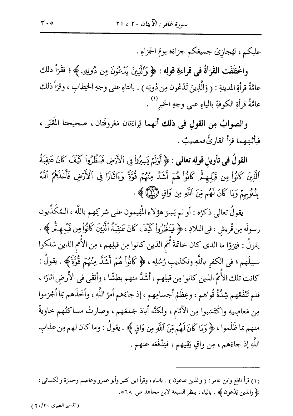 §الْقَوْلُ فِي تَأْوِيلِ قَوْلِهِ تَعَالَى: {أَوَلَمْ يَسِيرُوا فِي الْأَرْضِ فَيَنْظُرُوا كَيْفَ كَانَ عَاقِبَةُ الَّذِينَ كَانُوا مِنْ قَبْلِهِمْ كَانُوا هُمْ أَشَدَّ مِنْهُمْ قُوَّةً وَآثَارًا فِي الْأَرْضِ فَأَخَذَهُمُ اللَّهُ بِذُنُوبِهِمْ وَمَا كَانَ لَهُمْ مِنَ اللَّهِ مِنْ وَاقٍ} يَقُولُ تَعَالَى ذِكْرُهُ: أَوَلَمْ يَسِرْ هَؤُلَاءِ الْمُقِيمُونَ عَلَى شِرْكِهِمْ بِاللَّهِ، الْمُكَذِّبُونَ رَسُولَهُ مِنْ قُرَيْشٍ، فِي الْبِلَادِ، {فَيَنْظُرُوا كَيْفَ كَانَ عَاقِبَةُ الَّذِينَ كَانُوا مِنْ قَبْلِهِمْ} [غافر: 21] يَقُولُ: فَيَرَوْا مَا الَّذِي كَانَ خَاتِمَةُ أُمَمِ الَّذِينَ كَانُوا مِنْ قَبْلِهِمْ مِنَ الْأُمَمِ الَّذِينَ سَلَكُوا سَبِيلَهُمْ، فِي الْكُفْرِ بِاللَّهِ، وَتَكْذِيبِ رُسُلِهِ {كَانُوا هُمْ أَشَدَّ مِنْهُمْ قُوَّةً} [غافر: 21] يَقُولُ: كَانَتْ تِلْكَ الْأُمَمُ الَّذِينَ كَانُوا مِنْ قَبْلِهِمْ أَشَدَّ مِنْهُمْ بَطْشًا، وَأَبْقَى فِي الْأَرْضِ آثَارًا، فَلَمْ تَنْفَعْهُمْ شِدَّةُ قُوَاهُمْ، وَعِظَمُ أَجْسَامِهِمْ، إِذْ جَاءَهُمْ أَمْرُ اللَّهِ، وَأَخَذَهُمْ بِمَا أَجْرَمُوا مِنْ مَعَاصِيهِ، وَاكْتَسَبُوا مِنَ الْآثَامِ، وَلَكِنَّهُ أَبَادَ جَمَعَهُمْ، وَصَارَتْ مَسَاكِنُهُمْ خَاوِيَةً مِنْهُمْ بِمَا ظَلَمُوا {وَمَا كَانَ لَهُمْ مِنَ اللَّهِ مِنْ وَاقٍ} [غافر: 21] يَقُولُ: وَمَا كَانَ لَهُمْ مِنْ عَذَابِ اللَّهِ إِذْ جَاءَهُمْ، مِنْ وَاقٍ يَقِيهِمْ، فَيَدْفَعُهُ عَنْهُمْ