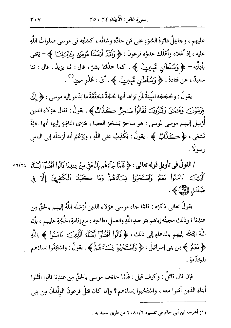 §الْقَوْلُ فِي تَأْوِيلِ قَوْلِهِ تَعَالَى: {فَلَمَّا جَاءَهُمْ بِالْحَقِّ مِنْ عِنْدِنَا قَالُوا اقْتُلُوا أَبْنَاءَ الَّذِينَ آمَنُوا مَعَهُ وَاسْتَحْيُوا نِسَاءَهُمْ وَمَا كَيْدُ الْكَافِرِينَ إِلَّا فِي ضَلَالٍ} [غافر: 25] يَقُولُ تَعَالَى ذِكْرُهُ: فَلَمَّا جَاءَ مُوسَى هَؤُلَاءِ الَّذِينَ أَرْسَلَهُ اللَّهُ إِلَيْهِمْ بِالْحَقِّ مِنْ عِنْدِنَا، وَذَلِكَ مَجِيئُهُ إِيَّاهُمْ بِتَوْحِيدِ اللَّهِ، وَالْعَمَلِ بِطَاعَتِهِ، مَعَ إِقَامَةِ الْحُجَّةِ عَلَيْهِمْ، بِأَنَّ اللَّهَ ابْتَعَثَهُ إِلَيْهِمْ بِالدُّعَاءِ إِلَى ذَلِكَ {قَالُوا اقْتُلُوا أَبْنَاءَ الَّذِينَ آمَنُوا} [غافر: 25] بِاللَّهِ {مَعَهُ} [البقرة: 214] مِنْ بَنِي إِسْرَائِيلَ {وَاسْتَحْيُوا نِسَاءَهُمْ} [غافر: 25] يَقُولُ: وَاسْتَبْقُوا نِسَاءَهُمْ لِلْخِدْمَةِ فَإِنْ قَالَ قَائِلٌ: وَكَيْفَ قِيلَ: فَلَمَّا جَاءَهُمْ مُوسَى بِالْحَقِّ مِنْ عِنْدِنَا قَالُوا: اقْتُلُوا أَبْنَاءَ الَّذِينَ آمَنُوا مَعَهُ وَاسْتَحْيُوا نِسَاءَهُمْ، وَإِنَّمَا كَانَ قَتْلُ فِرْعَوْنَ الْوِلْدَانَ مِنْ بَنِي