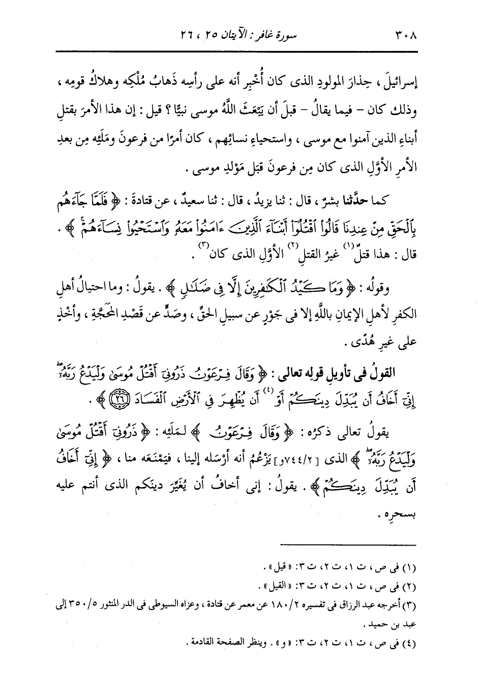 §الْقَوْلُ فِي تَأْوِيلِ قَوْلِهِ تَعَالَى: {وَقَالَ فِرْعَوْنُ ذَرُونِي أَقْتَلْ مُوسَى وَلْيَدْعُ رَبَّهُ إِنِّي أَخَافُ أَنْ يُبَدِّلَ دِينَكُمْ أَوِ أَنْ يُظْهِرَ فِي الْأَرْضِ الْفَسَادَ} [غافر: 26] يَقُولُ تَعَالَى ذِكْرُهُ: {وَقَالَ فِرْعَوْنُ} [يونس: 79] لِمَلَئِهِ: {ذَرُونِي أَقْتُلْ مُوسَى وَلْيَدْعُ رَبَّهُ} [غافر: 26] الَّذِي يَزْعُمُ أَنَّهُ أَرْسَلَهُ إِلَيْنَا فَيَمْنَعُهُ مِنَّا {إِنِّي أَخَافُ أَنْ يُبَدِّلَ دِينَكُمْ} [غافر: 26] يَقُولُ: إِنِّي أَخَافُ أَنْ يُغَيِّرَ دِينَكُمُ الَّذِي أَنْتُمْ عَلَيْهِ بِسِحْرِهِ