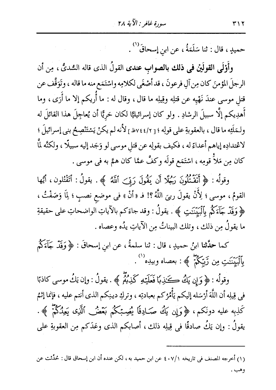 §وَقَوْلُهُ: {وَإِنْ يَكُ كَاذِبًا فَعَلَيْهِ كَذِبُهُ} [غافر: 28] يَقُولُ: وَإِنْ يَكُ مُوسَى كَاذِبًا فِي قِيلِهِ: إِنَّ اللَّهَ أَرْسَلَهُ إِلَيْكُمْ يَأْمُرُكُمْ بِعِبَادَتِهِ، وَتَرْكِ دِينِكُمُ الَّذِي أَنْتُمْ عَلَيْهِ، فَإِنَّمَا إِثْمٌ كِذْبُهُ عَلَيْهِ دُونَكُمْ {وَإِنْ يَكُ صَادِقًا يُصِبْكُمْ بَعْضُ الَّذِي يَعِدُكُمْ} [غافر: 28] يَقُولُ: وَإِنْ يَكُ صَادِقًا فِي قِيلِهِ ذَلِكَ، أَصَابَكُمُ الَّذِي وَعَدَكُمْ مِنَ الْعُقُوبَةِ عَلَى