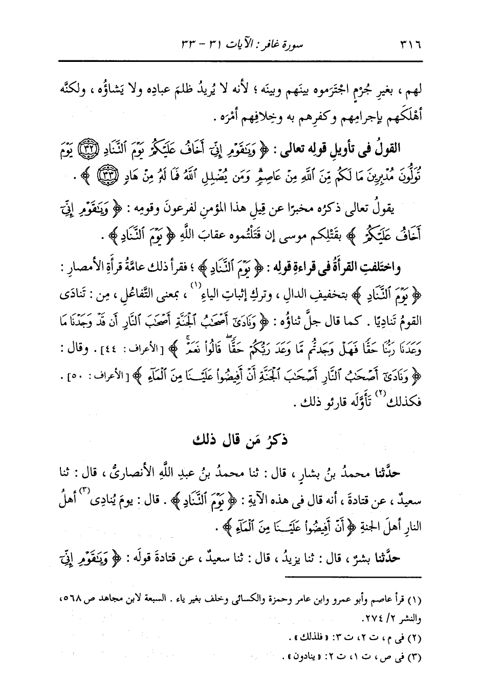 §الْقَوْلُ فِي تَأْوِيلِ قَوْلِهِ تَعَالَى: {يَا قَوْمِ إِنِّي أَخَافُ عَلَيْكُمْ يَوْمَ التَّنَادِ يَوْمَ تُوَلُّونَ مُدْبِرِينَ مَا لَكُمْ مِنَ اللَّهِ مِنْ عَاصِمٍ وَمَنْ يُضْلِلِ اللَّهُ فَمَا لَهُ مِنْ هَادٍ} [غافر: 33] يَقُولُ تَعَالَى ذِكْرُهُ مُخْبِرًا عَنْ قِيلِ هَذَا الْمُؤْمِنِ لِفِرْعَوْنَ وَقَوْمِهِ: {وَيَا قَوْمِ إِنِّي أَخَافُ عَلَيْكُمْ} [غافر: 32] بِقَتْلِكُمْ مُوسَى إِنْ قَتَلْتُمُوهُ عِقَابَ اللَّهِ {يَوْمَ التَّنَادِ} [غافر: 32] وَاخْتَلَفَتِ الْقُرَّاءُ فِي قِرَاءَةِ قَوْلِهِ: {يَوْمَ التَّنَادِ} [غافر: 32] فَقَرَأَ ذَلِكَ عَامَّةُ قُرَّاءِ الْأَمْصَارِ: {يَوْمَ التَّنَادِ} [غافر: 32] بِتَخْفِيفِ الدَّالِّ، وَتَرْكِ إِثْبَاتِ الْيَاءِ، بِمَعْنَى التَّفَاعُلِ، مِنْ تَنَادَى الْقَوْمُ تَنَادِيًا، كَمَا قَالَ جَلَّ ثَنَاؤُهُ: {وَنَادَى أَصْحَابُ الْجَنَّةِ أَصْحَابَ النَّارِ أَنْ قَدْ وَجَدْنَا مَا وَعَدَنَا رَبُّنَا حَقًّا فَهَلْ وَجَدْتُمْ مَا وَعَدَ رَبُّكُمْ حَقًّا قَالُوا نَعَمْ} [الأعراف: 44] وَقَالَ: {وَنَادَى أَصْحَابُ النَّارِ أَصْحَابَ الْجَنَّةِ أَنْ أَفِيضُوا عَلَيْنَا مِنَ الْمَاءِ} [الأعراف: 50] فَلِذَلِكَ تَأَوَّلَهُ قَارِئُو ذَلِكَ كَذَلِكَ
