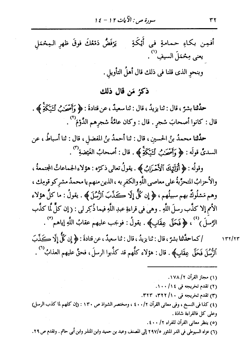 ذِكْرُ مَنْ قَالَ ذَلِكَ: حَدَّثَنَا بِشْرٌ، قَالَ: ثنا يَزِيدُ، قَالَ: ثنا سَعِيدٌ، عَنْ قَتَادَةَ، {§وَأَصْحَابُ الْأَيْكَةِ} [ص: 13] قَالَ: " كَانُوا أَصْحَابُ شَجَرٍ، قَالَ: وَكَانَ عَامَّةُ شَجَرِهِمُ الدُّومُ "