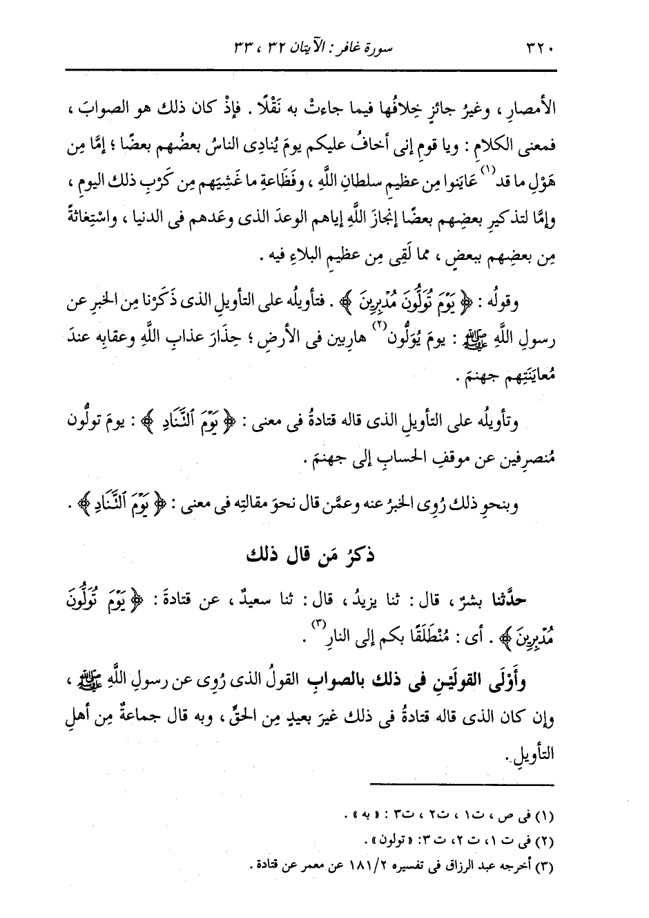 ذِكْرُ مَنْ قَالَ ذَلِكَ: حَدَّثَنَا بِشْرٌ، قَالَ: ثنا يَزِيدُ، قَالَ: ثنا سَعِيدٌ، عَنْ قَتَادَةَ، {§يَوْمَ تُوَلُّونَ مُدْبِرِينَ} [غافر: 33] «أَيْ مُنْطَلَقًا بِكُمْ إِلَى النَّارِ» وَأَوْلَى الْقَوْلَيْنِ فِي ذَلِكَ بِالصَّوَابِ الْقَوْلُ الَّذِي رُوِيَ عَنْ رَسُولِ اللَّهِ صَلَّى اللهُ عَلَيْهِ وَسَلَّمَ، وَإِنْ كَانَ الَّذِي قَالَهُ قَتَادَةُ فِي ذَلِكَ غَيْرَ بَعِيدٍ مِنَ الْحَقِّ، وَبِهِ قَالَ جَمَاعَةٌ مِنْ أَهْلِ التَّأْوِيلِ -[321]- ذِكْرُ مَنْ قَالَ ذَلِكَ: حَدَّثَنِي مُحَمَّدُ بْنُ عَمْرٍو، قَالَ: ثنا أَبُو عَاصِمٍ، قَالَ: ثنا عِيسَى، وَحَدَّثَنِي الْحَارِثُ، قَالَ: ثنا الْحَسَنُ، قَالَ: ثنا وَرْقَاءُ، جَمِيعًا الْقَوْلَ الَّذِي رُوِيَ عَنْ رَسُولِ اللَّهِ، صَلَّى اللهُ عَلَيْهِ وَسَلَّمَ، وَإِنْ كَانَ الَّذِي قَالَهُ قَتَادَةُ فِي ذَلِكَ غَيْرَ بَعِيدٍ مِنَ الْحَقِّ، وَبِهِ قَالَ جَمَاعَةٌ مِنْ أَهْلِ التَّأْوِيلِ