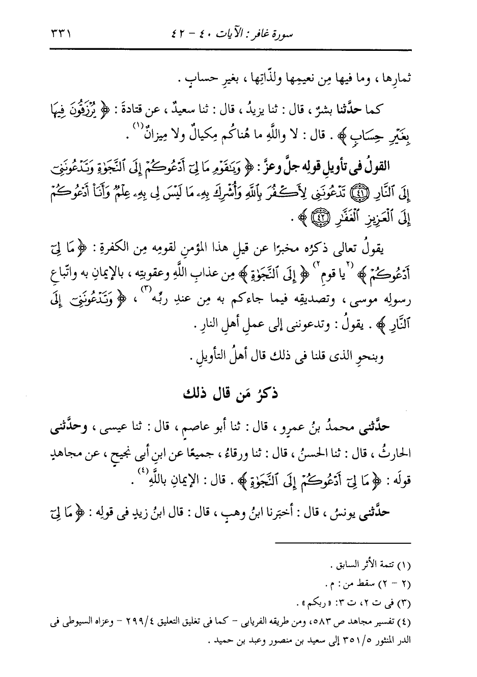 ذِكْرُ مَنْ قَالَ ذَلِكَ: حَدَّثَنِي مُحَمَّدُ بْنُ عَمْرٍو، قَالَ: ثنا أَبُو عَاصِمٍ، قَالَ: ثنا عِيسَى، وَحَدَّثَنِي الْحَارِثُ، قَالَ: ثنا الْحَسَنُ، قَالَ: ثنا وَرْقَاءُ، جَمِيعًا عَنِ ابْنِ أَبِي نَجِيحٍ، عَنْ مُجَاهِدٍ، قَوْلُهُ: {§مَا لِي أَدْعُوكُمْ إِلَى النَّجَاةِ} [غافر: 41] قَالَ: «الْإِيمَانِ بِاللَّهِ»
