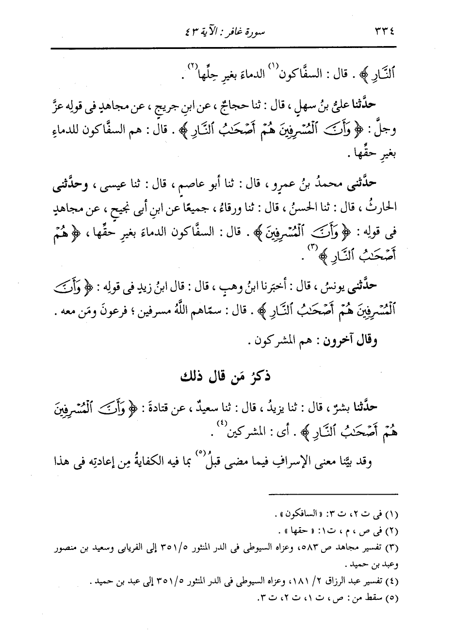 حَدَّثَنِي مُحَمَّدُ بْنُ عَمْرٍو، قَالَ: ثنا أَبُو عَاصِمٍ، قَالَ: ثنا عِيسَى؛ وَحَدَّثَنِي الْحَارِثُ، قَالَ: ثنا الْحَسَنُ، قَالَ: ثنا وَرْقَاءُ جَمِيعًا عَنِ ابْنِ أَبِي نَجِيحٍ، عَنْ مُجَاهِدٍ، فِي قَوْلِهِ: {§وَأَنَّ الْمُسْرِفِينَ} [غافر: 43] قَالَ: «السَّفَّاكُونَ الدِّمَاءَ بِغَيْرِ حَقِّهَا، هُمْ أَصْحَابُ النَّارِ»