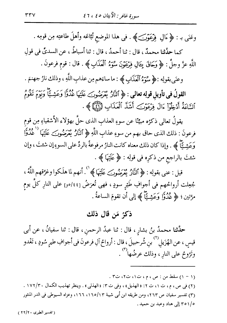 §الْقَوْلُ فِي تَأْوِيلِ قَوْلِهِ تَعَالَى: {النَّارُ يُعْرَضُونَ عَلَيْهَا غُدُوًّا وَعَشِيًّا وَيَوْمَ تَقُومُ السَّاعَةُ أَدْخِلُوا آلَ فِرْعَوْنَ أَشَدَّ الْعَذَابِ} [غافر: 46] يَقُولُ تَعَالَى ذِكْرُهُ مُبِينًا عَنْ سُوءِ الْعَذَابِ الَّذِي حَلَّ بِهَؤُلَاءِ الْأَشْقِيَاءِ مِنْ قَوْمِ فِرْعَوْنَ ذَلِكَ الَّذِي حَاقَ بِهِمْ مِنْ سُوءِ عَذَابِ اللَّهِ {النَّارُ يُعْرَضُونَ عَلَيْهَا} [غافر: 46] إِنَّهُمْ لَمَّا هَلَكُوا وَغَرَّقَهُمُ اللَّهُ، جُعِلَتْ أَرْوَاحُهُمْ فِي أَجْوَافِ طَيْرٍ سُودٍ، فَهِيَ تُعْرَضُ عَلَى النَّارِ كُلَّ يَوْمٍ مَرَّتَيْنِ {غُدُوًّا وَعَشِيًّا} [غافر: 46] إِلَى أَنْ تَقُومَ السَّاعَةُ