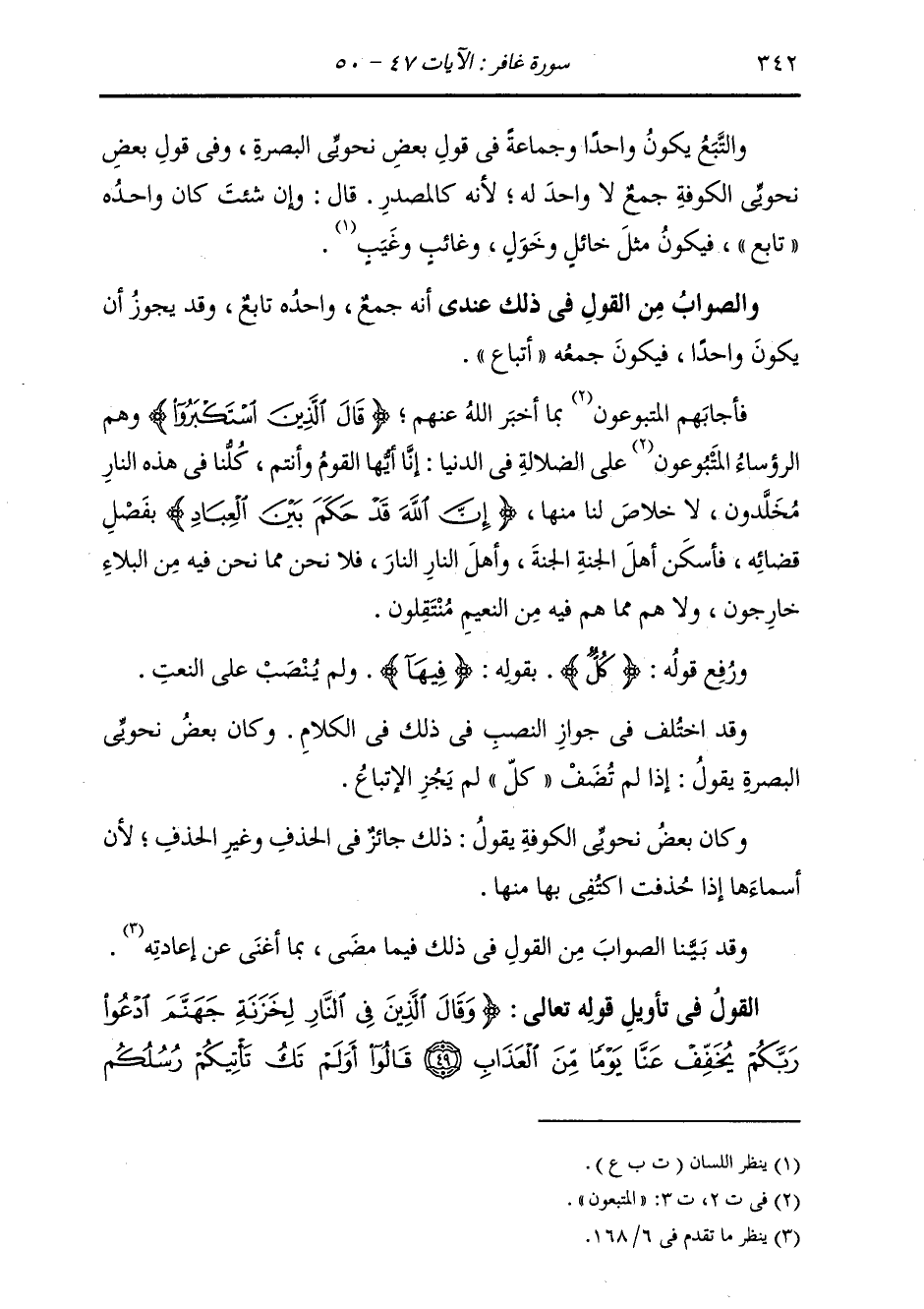 وَالتَّبَعُ يَكُونُ وَاحِدًا وَجَمَاعَةً فِي قَوْلِ بَعْضِ نَحْوِيِّي الْبَصْرَةِ، وَفِي قَوْلِ بَعْضِ نَحْوِيِّي الْكُوفَةِ جَمْعٌ لَا وَاحِدَ لَهُ، لِأَنَّهُ كَالْمَصْدَرِ قَالَ: وَإِنْ شِئْتَ كَانَ وَاحِدُهُ تَابِعُ، فَيَكُونُ مِثْلَ خَائِلٍ وَخَوْلٍ، وَغَائِبٍ وَغَيْبٍ وَالصَّوَابُ مِنَ الْقَوْلِ فِي ذَلِكَ عِنْدِي أَنَّهُ جَمْعُ وَاحِدُهُ تَابِعٌ وَقَدْ يَجُوزُ أَنْ يَكُونَ وَاحِدًا فَيَكُونُ جَمْعُهُ أَتْبَاعُُ فَأَجَابَهُمُ الْمَتْبُوعُونَ بِمَا أَخْبَرَ اللَّهُ عَنْهُمْ؛ قَالَ الَّذِينَ اسْتَكْبَرُوا، وَهُمُ الرُّؤَسَاءُ الْمَتْبُوعُونَ عَلَى الضَّلَالَةِ فِي الدُّنْيَا: إِنَّا أَيُّهَا الْقَوْمُ وَأَنْتُمْ كُلُّنَا فِي هَذِهِ النَّارِ مُخَلَّدُونَ، لَا خَلَاصَ لَنَا مِنْهَا {إِنَّ اللَّهَ قَدْ حَكَمَ بَيْنَ الْعِبَادِ} [غافر: 48] بِفَصْلِ قَضَائِهِ، فَأَسْكَنَ أَهْلَ الْجَنَّةِ الْجَنَّةَ، وَأَهْلَ النَّارِ النَّارَ، فَلَا نَحْنُ مِمَّا نَحْنُ فِيهِ مِنَ الْبَلَاءِ خَارِجُونَ، وَلَا هُمْ مِمَّا فِيهِ مِنَ النَّعِيمِ مُنْتَقِلُونَ؛ وَرُفِعَ قَوْلُهُ {كُلٌّ} [البقرة: 20] بِقَوْلِهِ {فِيهَا} [البقرة: 25] وَلَمْ يُنْصَبْ عَلَى النَّعْتِ وَقَدِ اخْتُلِفَ فِي جَوَازِ النَّصْبِ فِي ذَلِكَ فِي الْكَلَامِ وَكَانَ بَعْضُ نَحْوِيِّي الْبَصْرَةِ يَقُولُ: إِذَا لَمْ يُضَفْ كُلُّ لَمْ يَجُزِ الِاتِّبَاعُ وَكَانَ بَعْضُ نَحْوِيِّي الْكُوفَةِ يَقُولُ: ذَلِكَ جَائِزٌ فِي الْحَذْفِ وَغَيْرِ الْحَذَفِ، لِأَنَّ أَسْمَاءَهَا إِذَا حُذِفَتِ اكْتُفِيَ بِهَا مِنْهَا وَقَدْ بَيَّنَّا الصَّوَابَ مِنَ الْقَوْلِ فِي ذَلِكَ فِيمَا مَضَى بِمَا أَغْنَى عَنْ إِعَادَتِهِ