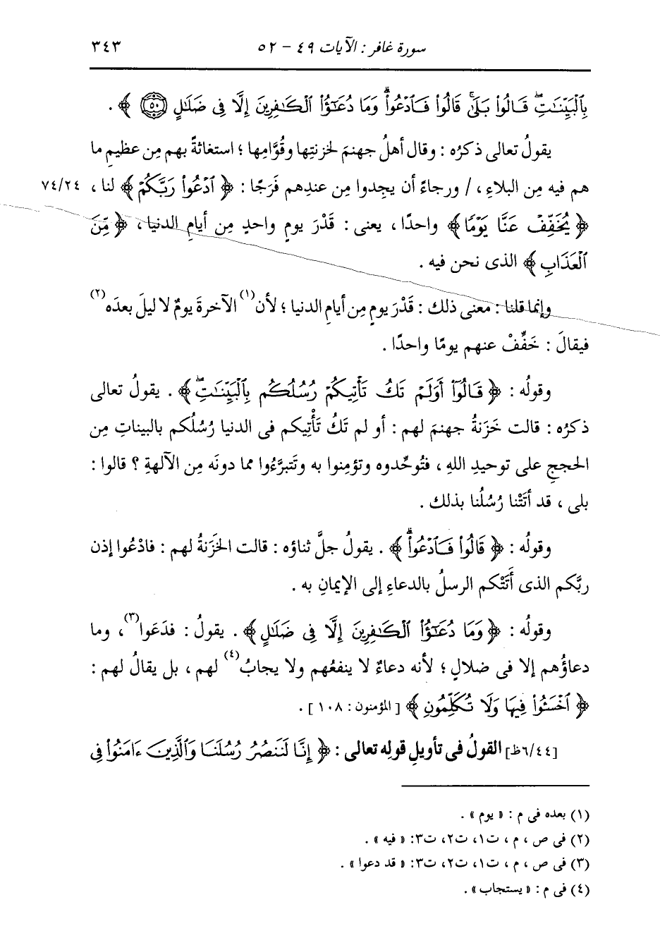 §وَقَوْلُهُ: {قَالُوا فَادْعُوا} [غافر: 50] يَقُولُ جَلَّ ثَنَاؤُهُ: قَالَتِ الْخَزَنَةُ لَهُمْ: فَادْعُوا إِذَنْ رَبَّكُمُ الَّذِي أَتَتْكُمُ الرُّسُلُ بِالدُّعَاءِ إِلَى الْإِيمَانِ بِهِ