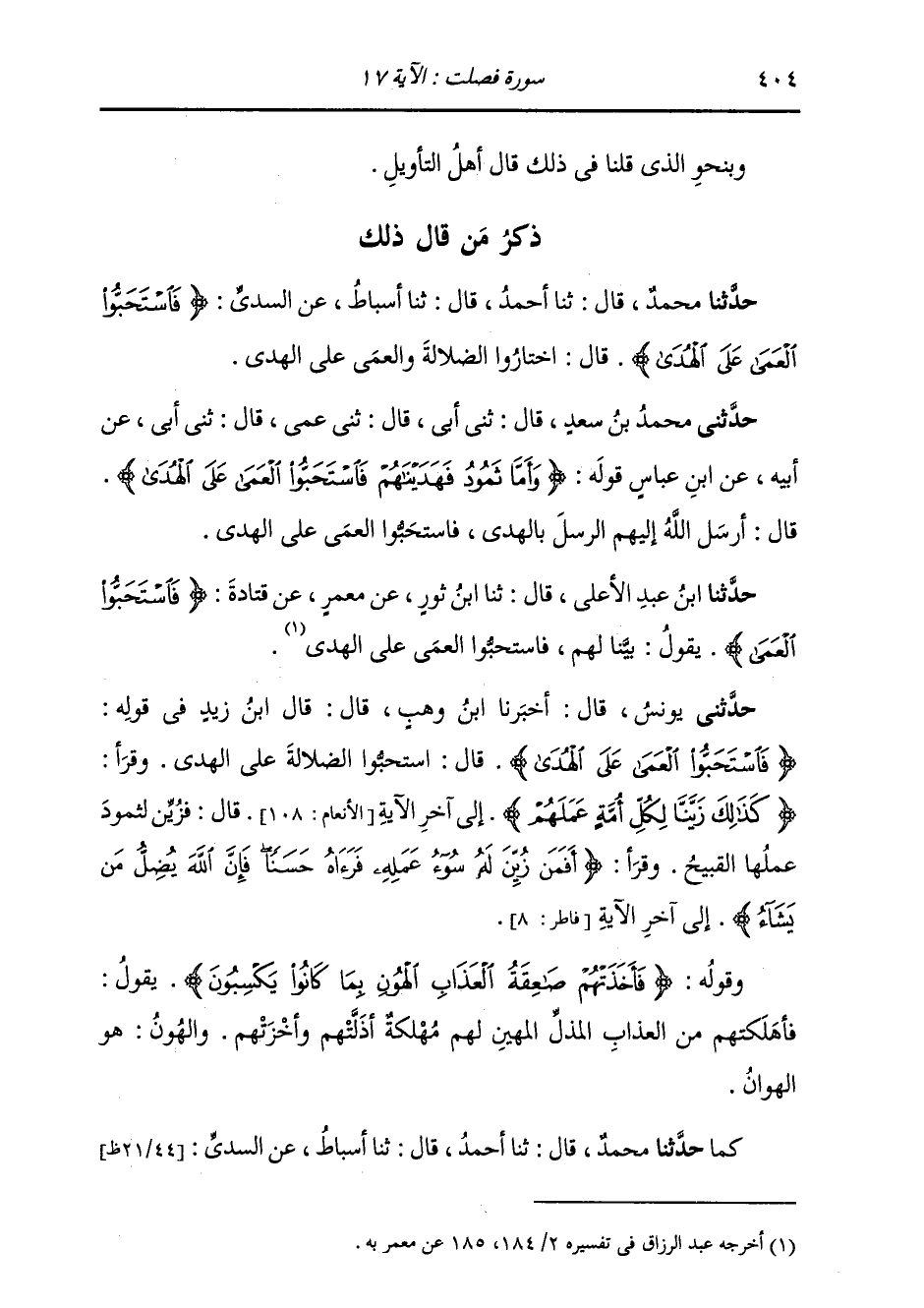 ذِكْرُ مَنْ قَالَ ذَلِكَ: حَدَّثَنَا مُحَمَّدٌ، قَالَ: ثنا أَحْمَدُ، قَالَ: ثنا أَسْبَاطٌ، عَنِ السُّدِّيِّ، {§فَاسْتَحَبُّوا الْعَمَى عَلَى الْهُدَى} [فصلت: 17] قَالَ: «اخْتَارُوا الضَّلَالَةَ وَالْعَمَى عَلَى الْهُدَى»