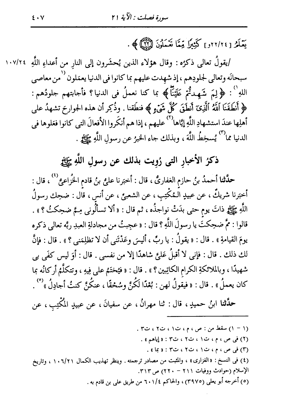 ذِكْرُ الْأَخْبَارِ الَّتِي رُوِيَتْ عَنْ رَسُولِ اللَّهِ صَلَّى اللهُ عَلَيْهِ وَسَلَّمَ: حَدَّثَنَا أَحْمَدُ بْنُ حَازِمٍ الْغِفَارِيُّ، قَالَ: أَخْبَرَنَا عَلِيُّ بْنُ قَادِمٍ الْفَزَارِيُّ، قَالَ: أَخْبَرَنَا شَرِيكٌ، عَنْ عُبَيْدٍ الْمُكْتِبِ، عَنِ الشَّعْبِيِّ، عَنْ أَنَسٍ، قَالَ: ضَحِكَ رَسُولُ اللَّهِ صَلَّى اللهُ عَلَيْهِ وَسَلَّمَ ذَاتَ يَوْمٍ حَتَّى بَدَتْ نَوَاجِذُهُ، ثُمَّ قَالَ: «أَلَا تَسْأَلُونِي مِمَّ ضَحِكْتُ؟» قَالُوا: مِمَّ ضَحِكْتَ يَا رَسُولَ اللَّهِ؟ قَالَ: " §عَجِبْتُ مِنْ مُجَادَلَةِ الْعَبْدِ رَبَّهُ يَوْمَ الْقِيَامَةِ قَالَ: يَقُولُ: يَا رَبِّ أَلَيْسَ وَعَدْتَنِي أَنْ لَا تَظْلِمَنِي؟ قَالَ: فَإِنَّ لَكَ ذَلِكَ، قَالَ: فَإِنِّي لَا أَقْبَلُ عَلَيَّ شَاهِدًا إِلَّا مِنْ نَفْسِي، قَالَ: أَوَلَيْسَ كَفَى بِي شَهِيدًا، وَبِالْمَلَائِكَةِ الْكِرَامِ الْكَاتِبِينَ؟ قَالَ فَيُخْتَمُ عَلَى فِيهِ، وَتَتَكَلَّمُ أَرْكَانُهُ بِمَا كَانَ يَعْمَلُ، قَالَ: فَيَقُولُ لَهُنَّ: بُعْدًا لَكُنَّ وَسُحْقًا، عَنْكُنَّ كُنْتُ أُجَادِلُ " حَدَّثَنَا ابْنُ حُمَيْدٍ، قَالَ: ثنا مِهْرَانُ، عَنْ سُفْيَانَ، عَنْ عُبَيْدٍ الْمُكْتِبِ، عَنْ -[408]- فُضَيْلِ بْنِ عَمْرٍو، عَنِ الشَّعْبِيِّ، عَنْ أَنَسٍ، عَنِ النَّبِيِّ صَلَّى اللهُ عَلَيْهِ وَسَلَّمَ بِنَحْوِهِ