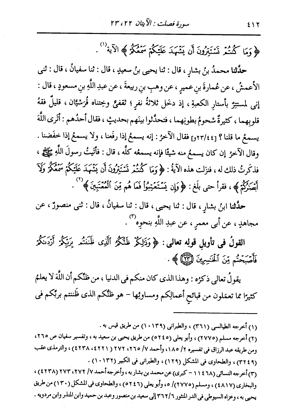 حَدَّثَنَا مُحَمَّدُ بْنُ بَشَّارٍ، قَالَ: ثنا يَحْيَى بْنُ سَعِيدٍ، قَالَ: ثنا سُفْيَانُ، قَالَ: ثني الْأَعْمَشُ، عَنْ عُمَارَةَ بْنِ عُمَيْرٍ، عَنْ وَهْبِ بْنِ رَبِيعَةَ، عَنْ عَبْدِ اللَّهِ بْنِ مَسْعُودٍ، قَالَ: " إِنِّي لَمُسْتَتِرٌ بِأَسْتَارِ الْكَعْبَةِ، إِذْ دَخَلَ ثَلَاثَةُ نَفَرٍ، ثَقَفِيٌّ وَخَتَنَاهُ قُرَشِيَّانِ، قَلِيلٌ فِقْهُ قُلُوبِهِمَا، كَثِيرٌ شُحُومُ بُطُونِهِمَا، فَتَحَدَّثُوا بَيْنَهُمْ بِحَدِيثٍ، فَقَالَ أَحَدُهُمْ: أَتَرَى اللَّهَ يَسْمَعُ مَا قُلْنَا؟ فَقَالَ الْآخَرُ: إِنَّهُ يَسْمَعُ إِذَا رَفَعْنَا، وَلَا يَسْمَعُ إِذَا خَفَضْنَا. وَقَالَ الْآخَرُ: إِذَا كَانَ يَسْمَعُ مِنْهُ شَيْئًا فَهُوَ يَسْمَعُهُ كُلَّهُ، قَالَ: فَأَتَيْتُ رَسُولَ اللَّهِ صَلَّى اللهُ عَلَيْهِ وَسَلَّمَ، فَذَكَرْتُ ذَلِكَ لَهُ، فَنَزَلَتْ هَذِهِ الْآيَةُ: {§وَمَا كُنْتُمْ تَسْتَتِرُونَ أَنْ يَشْهَدَ عَلَيْكُمْ سَمْعُكُمْ وَلَا أَبْصَارُكُمْ} [فصلت: 22] . . . حَتَّى بَلَغَ {وَإِنْ يَسْتَعْتِبُوا فَمَا هُمْ مِنَ الْمُعْتَبِينَ} [فصلت: 24] حَدَّثَنَا ابْنُ بَشَّارٍ، قَالَ: ثنا يَحْيَى، قَالَ: ثنا سُفْيَانُ، قَالَ: ثني مَنْصُورٌ، عَنْ مُجَاهِدٍ، عَنْ أَبِي مَعْمَرٍ، عَنْ عَبْدِ اللَّهِ بِنَحْوِهِ