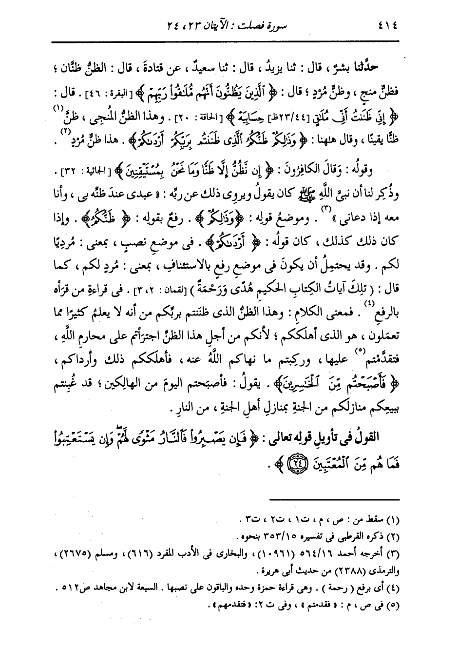 §وَقَوْلُهُ: {وَقَالَ الْكَافِرُونَ إِنْ نَظُنُّ إِلَّا ظَنًّا وَمَا نَحْنُ بِمُسْتَيْقِنِينَ} وَذُكِرَ لَنَا أَنَّ نَبِيَّ اللَّهِ صَلَّى اللهُ عَلَيْهِ وَسَلَّمَ كَانَ يَقُولُ وَيَرْوِي ذَلِكَ عَنْ رَبِّهِ: «عَبْدِي عِنْدَ ظَنِّهِ بِي، وَأَنَا مَعَهُ إِذَا دَعَانِي» وَمَوْضِعُ قَوْلِهِ: {ذَلِكُمْ} [البقرة: 49] رَفْعٌ بِقَوْلِهِ ظَنُّكُمْ، وَإِذَا كَانَ ذَلِكَ كَذَلِكَ، كَانَ قَوْلُهُ: {أَرْدَاكُمْ} [فصلت: 23] فِي مَوْضِعِ نَصْبٍ بِمَعْنَى: مُرْدِيًا لَكُمْ وَقَدْ يُحْتَمَلُ أَنْ يَكُونَ فِي مَوْضِعِ رَفْعٍ بِالِاسْتِئْنَافِ، بِمَعْنَى: مُرْدٍ لَكُمْ، كَمَا قَالَ: {تِلْكَ آيَاتُ الْكِتَابِ الْحَكِيمِ هُدًى وَرَحْمَةً} [لقمان: 3] فِي قِرَاءَةِ مَنْ قَرَأَهُ بِالرَّفْعِ فَمَعْنَى الْكَلَامِ: هَذَا الظَّنُّ الَّذِي ظَنَنْتُمْ بِرَبِّكُمْ مِنْ أَنَّهُ لَا يَعْلَمُ كَثِيرًا مِمَّا تَعْمَلُونَ هُوَ الَّذِي أَهْلَكَكُمْ، لِأَنَّكُمْ مِنْ أَجْلِ هَذَا الظَّنِّ اجْتَرَأْتُمْ عَلَى مَحَارِمِ اللَّهِ فَقَدِمْتُمْ عَلَيْهَا، وَرَكِبْتُمْ مَا نَهَاكُمُ اللَّهُ عَنْهُ، فَأَهْلَكَكُمْ ذَلِكَ وَأَرْدَاكُمْ {فَأَصْبَحْتُمْ مِنَ الْخَاسِرِينَ} [فصلت: 23] يَقُولُ: فَأَصْبَحْتُمُ الْيَوْمَ مِنَ الْهَالِكِينَ، قَدْ غَبَنْتُمْ بِبَيْعِكُمْ مَنَازِلَكُمْ مِنَ الْجَنَّةِ بِمَنَازِلِ أَهْلِ الْجَنَّةِ مِنَ النَّارِ