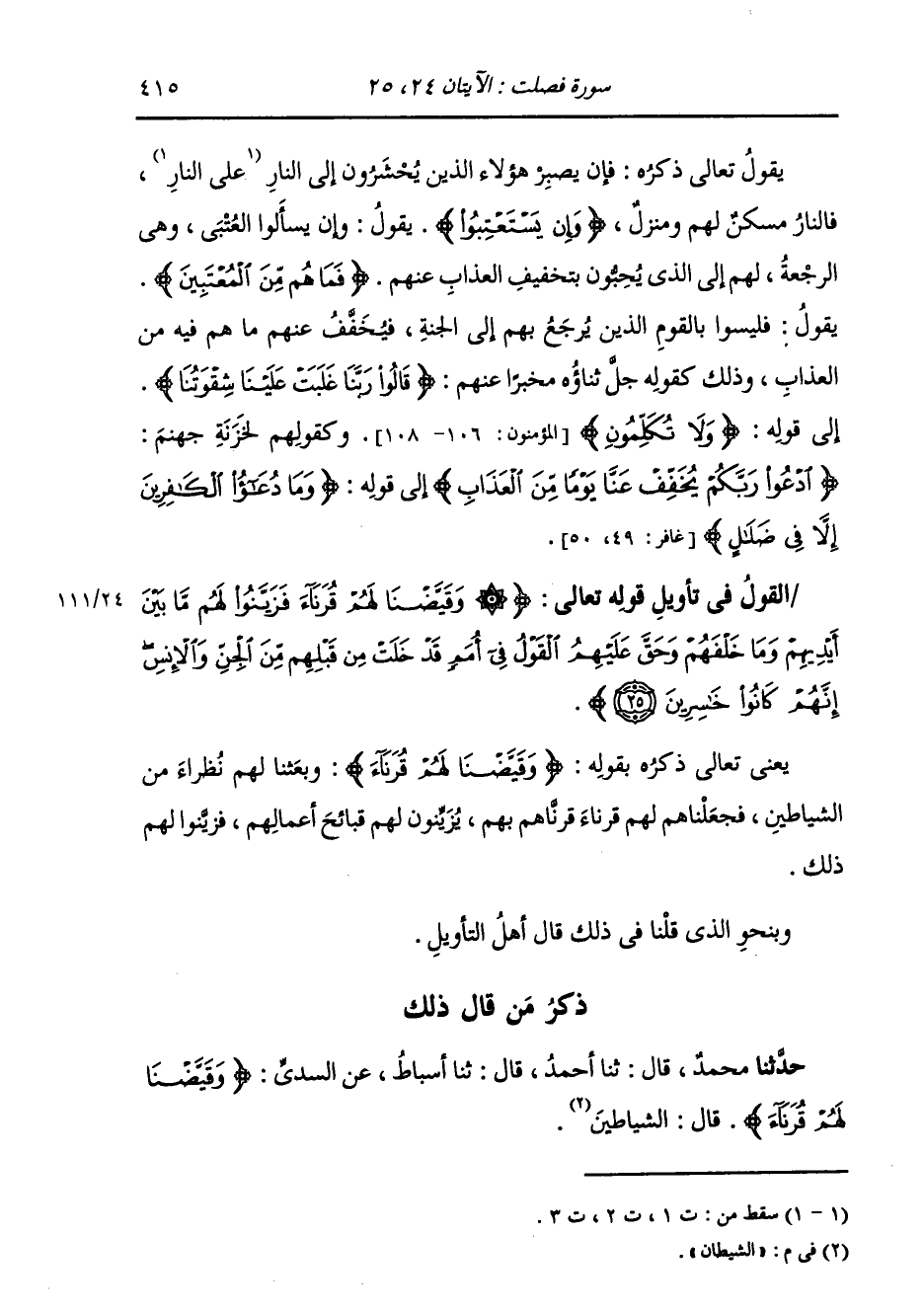 ذِكْرُ مَنْ قَالَ ذَلِكَ: حَدَّثَنَا مُحَمَّدٌ، قَالَ: ثنا أَحْمَدُ، قَالَ: ثنا أَسْبَاطٌ، عَنِ السُّدِّيِّ {§وَقَيَّضْنَا لَهُمْ قُرَنَاءَ} [فصلت: 25] قَالَ: «الشَّيْطَانَ»